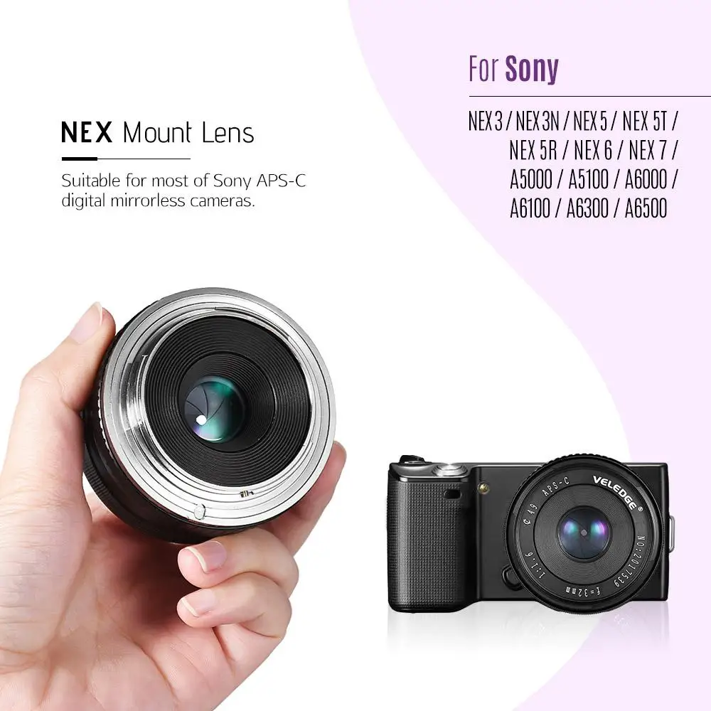 Особенности: Объектив VELEDGE 32 мм F1.6 Подходит Для беззеркальных камер sony APS-C. Необходимо вручную установить диафрагму и фокус. Объектив хорошо подходит для пейзажной и портретной съемки, он имеет максимальную диафрагму f/1,6. Что позволяет снимать в ночное время и в темноте.