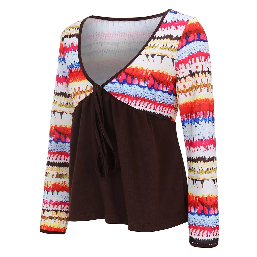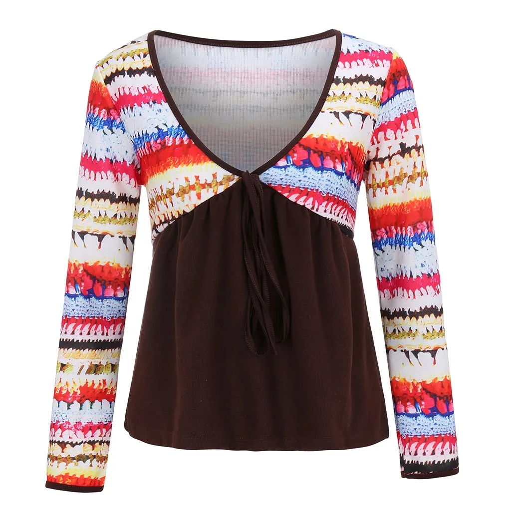 Женская этническая винтажная блузка с длинным рукавом и v-образным вырезом, свитер с длинным рукавом