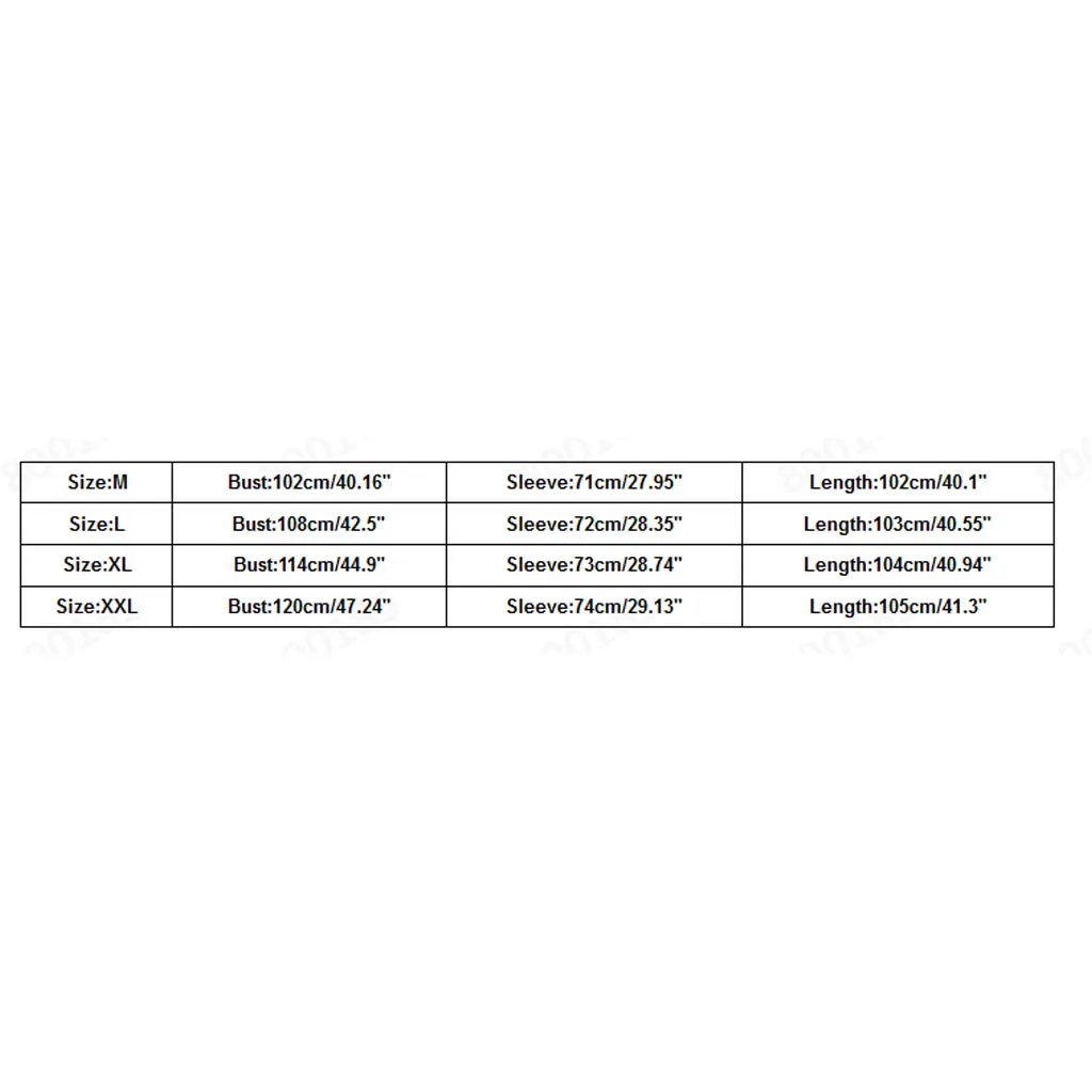 Размер Обхват груди Рукава Длина М 102 см/40,16'' 71 см/27,95'' 102 см/40,1'' L 108 см/42,5" 72 см/28,35'' 103 см/40,55'' XL 114 см/44,9'' 73 см/28,74'' 104 см/40,94'' XXL 120 см/47,24'' 74 см/29,13'' 105 см/41,3''