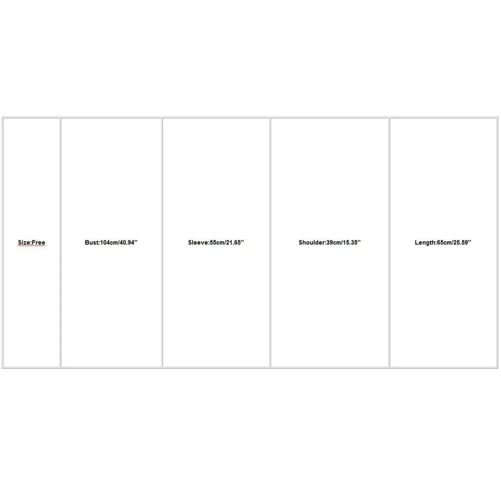 Размер: бесплатноОбхват груди: 104 см/40,94 дюймаРукав: 55 см/21,65 дюймаПлечо: 39 см/15,35 дюймаДлина: 65 см/25,59''