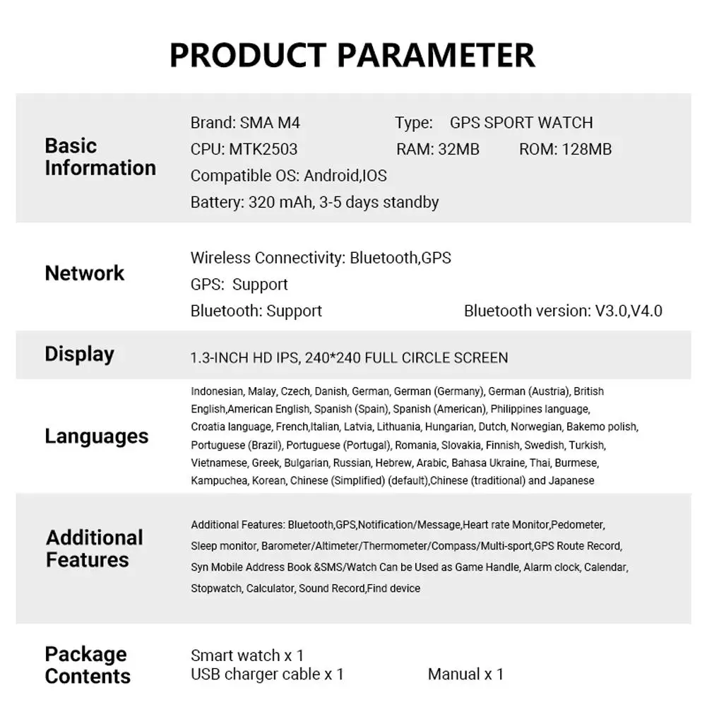 Функции: компас, датчик давления, атмосферное давление, высота, геомагнитный, громкоговоритель, время/дата, сжигание калорий, автоматическая запись активности (ходьба, дистанционное управление, бег), встроенный GPS трек записи (Крытый бег, открытый бег, Велоспорт, альпинизм, марафон), дышащие тренировки, автоматический монитор сна, Напоминание о сообщениях/сообщениях в социальных сетях, будильник, энергосбережение, управление фотографиями, воспроизведение музыки Bluetooth/микрофон/динамик/Синхронизация с мобильный телефон