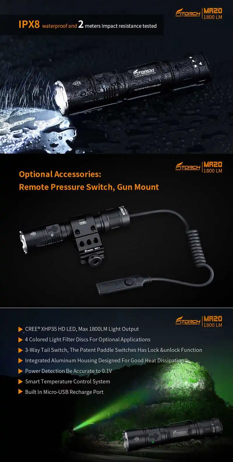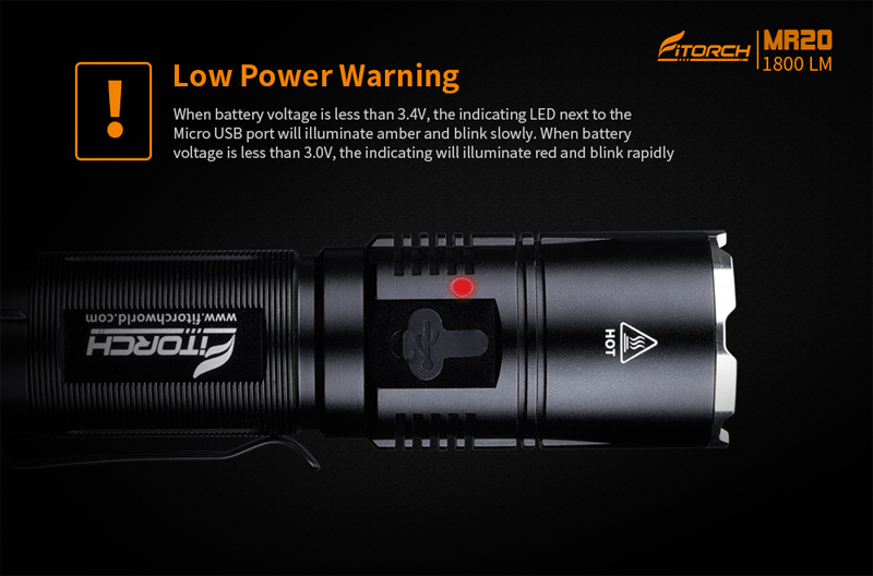 Торговая марка: FITORCH Модель: MR20 Излучатель Тип: XHP35 светодиодный Светильник Выход: Макс 1800 люмен Диапазоны: 279 метр Режим: Турбо, высокий, средний, низкий, сверхмощный, Strobes Батарея конфигурации:1x3,7 V 18650 li-ion/2x3V CR123A литиевая первичная(Не входит в комплект)