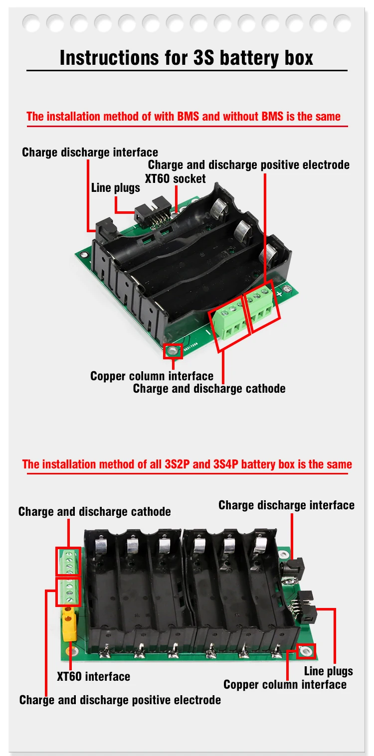 Параметры продукта Аккумулятор 3S2P Вес: 134 г Размер: 150*85*25 мм Напряжение: 12 В Емкость: 3 Ач На что следует обратить внимание 1. Для зарядки 3S требуется зарядное устройство 12,6 В. 2. Зарядное устройство 25,2 в требуется для зарядки 6S. 3. Рекомендуется, чтобы ток зарядки каждого слоя не превышал 2 А, в противном случае батарея может нагреваться (например, выберите 2A зарядное устройство только для одного слоя, И зарядное устройство 4A для двух слоев). 4. Не ставьте на металлическую столешницу для использования, обратите внимание на изоляцию, не короткого замыкания. 5. Аккумулятор поднимается на печатную плату, все аккумуляторы сталкиваются с таким же образом, что и другие. 6. Не подключайте неправильный источник питания, печатная плата отмечена, обратите внимание на наблюдение. Примечания к покупке Из-за недопонимания этого продукта, специально указано, что заказ известен следующим образом: 1. Направление батареи всех чехлов батарей зависит от платы PCB. 2. Продукт только печатная плата, не содержит батарею, батарейный блок и BMS приобретаются отдельно 3. Если используется в качестве многослойной аккумуляторной станции, Выберите кусок с защитной пластиной, а остальные варианты не имеют защитную пластину. Защитная пластина может обеспечить функцию выравнивания баланса для всего многослойного чехла батареи, без необходимости добавления защитной пластины к каждому слою.