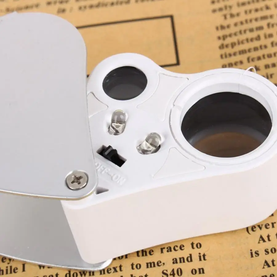 Specification: Model: 9889 Product size: 55*40*28 mm(folding),98*42*31 mm(open) Material: Optical glass, metal,plastic Magnification: 30X,60X Lens Diameter: 22 mm,12 mm Lens Type: Triplet Light: 2 white light LEDs Battery: 3 LR1130 (included) Features: Optical glass lens provides clear view field. 2 bright led light provides sufficient light at any condition. UV lamp can be used as money checker. Folding metal cover protects lens. Coin size convenient to carry and use any where. Can be print as per your request. Excellent as gifts to promote brand and business. Application: Used for jewelry, diamond, jade,antiques, stamps, coins identifying Used for research Used for gardening maintain, hydro farm and garden plants inspection Used for printing industry, currency,drafts authentication Used for watch making,repairing and fine tooling Used for brand and business promotion Package Includes: