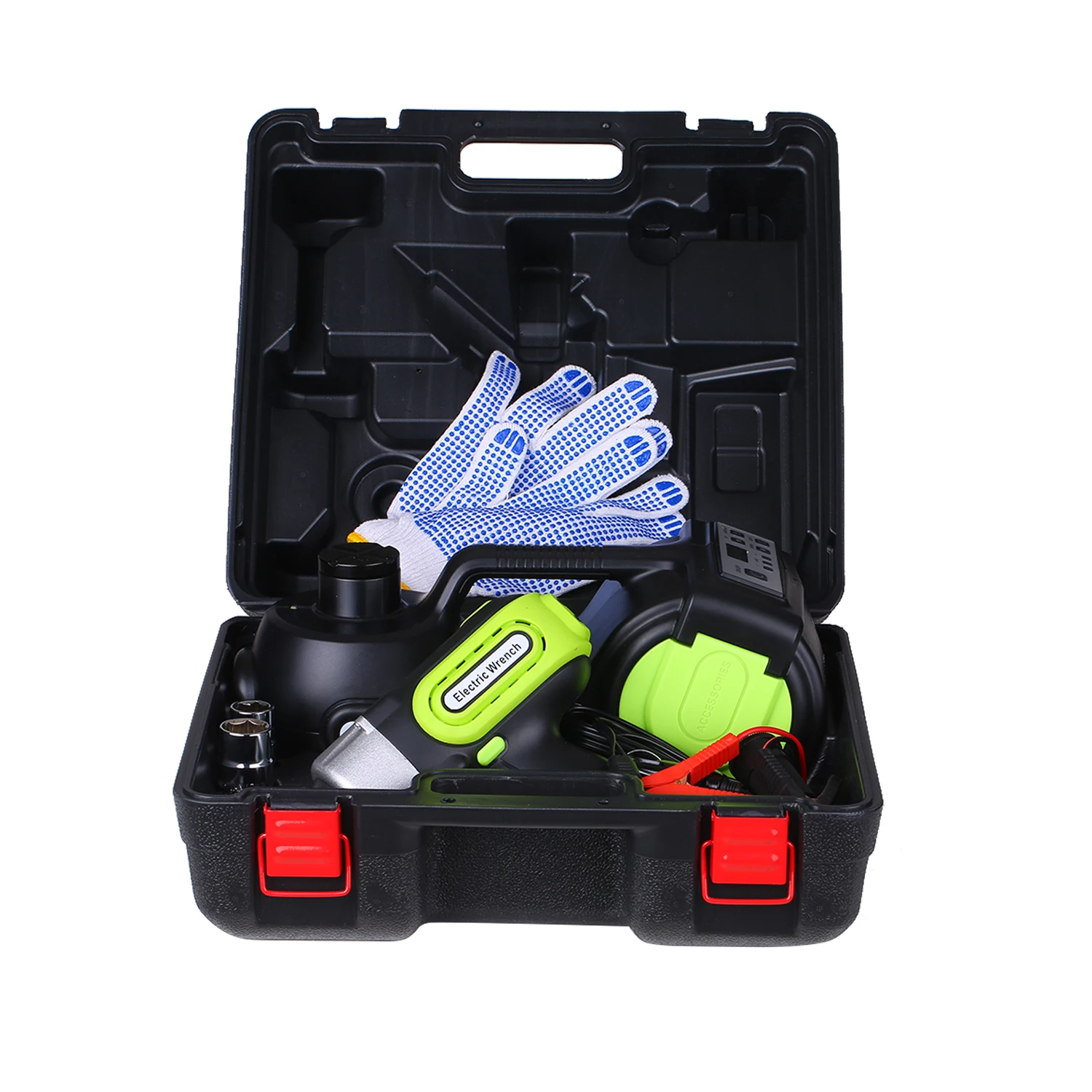 Комплект для ремонта автомобиля включает: Электрический домкрат, Электрический гаечный ключ, два гнезда, пару перчаток, удлинитель, зажим аккумулятора, автомобильное зарядное устройство и прочный чехол для хранения.