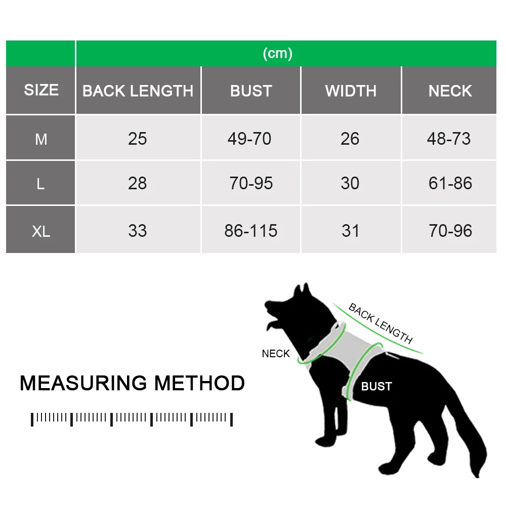 Size-------Neck----------Bust---------Width---------Back length M--------48-73cm-----49-70cm-----------26cm-----------25cm L---------61-86cm-----70-95cm-----------30cm-----------28cm XL-------70-96cm------86-115cm---------31cm-----------33cm