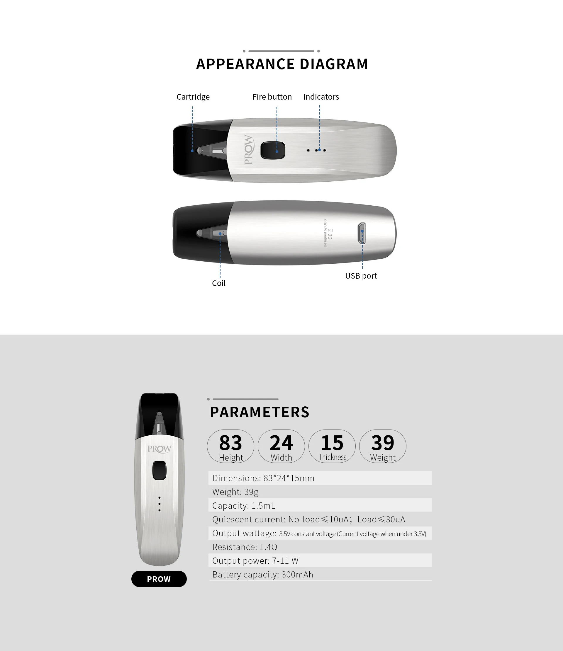 Размер: 24x83x15 мм Емкость аккумулятора: 300 мАч встроенный аккумулятор Емкость стручки: 1,5 мл Наполнитель: снизу заполнения Сопротивление: 1.4ohm Выходная мощность: 7 ~ 11 Вт Цвет: хром, черный, Gunmetal