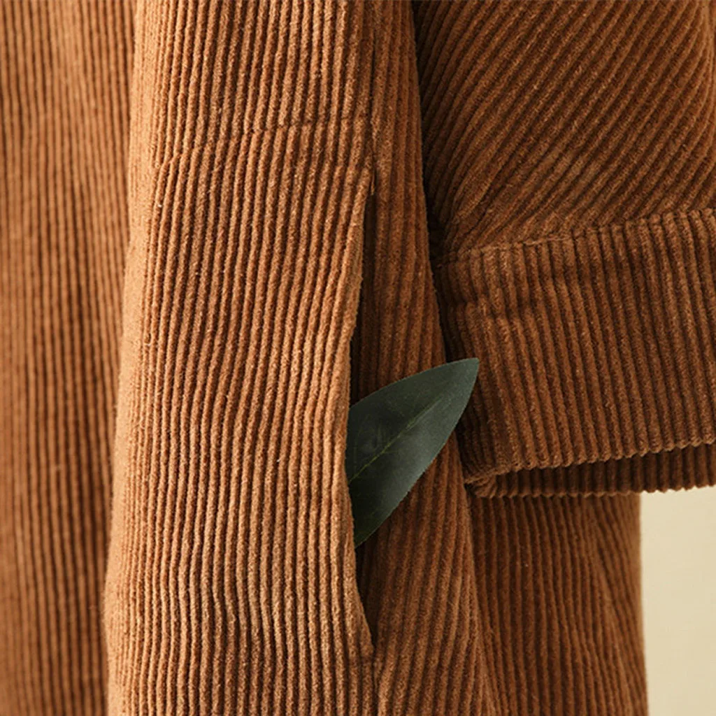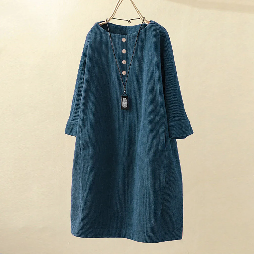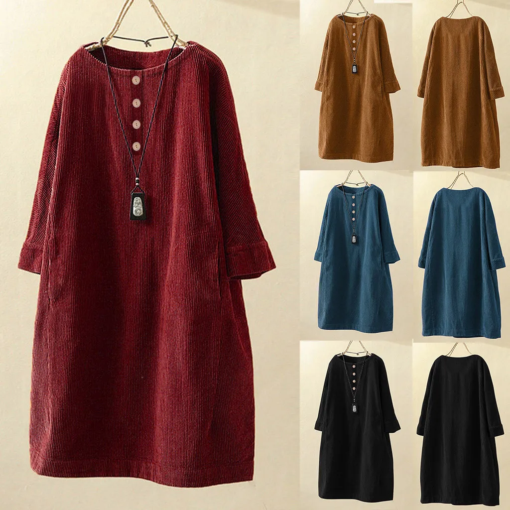 2019 зимнее модное Трендовое платье для женщин, винтажное вельветовое одноцветное свободное Повседневное платье с карманами и рукавами на пуговицах размера плюс