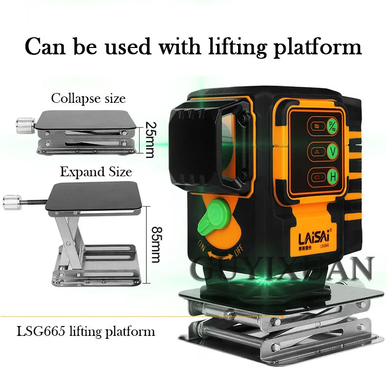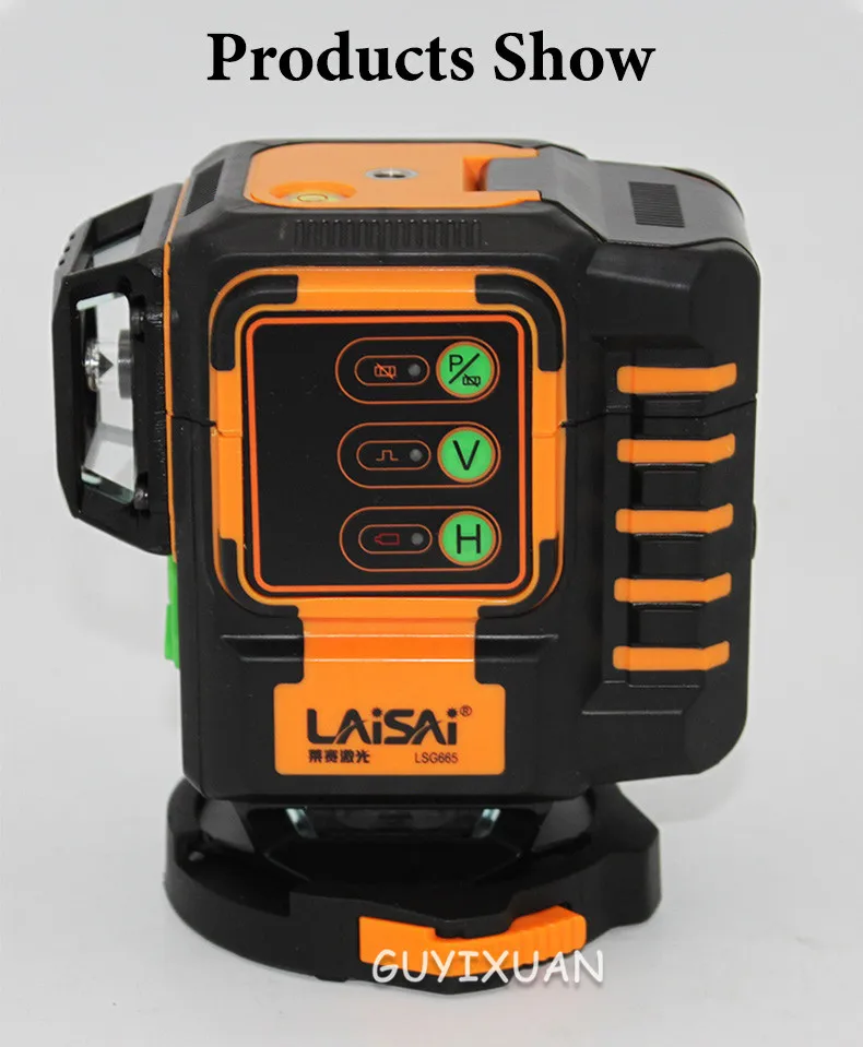 Модель продукта: LSG665 Длина волны лазера: 515nm Лазерный: classll Точность: почвы 1,5 мм/5m Диапазон измерения: ± 3 ° Диапазон температур: -10 °C ~ 45 °C Мощность: литиевая батарея или зарядное устройство Подсказка низкого напряжения: индикатор питания Размер продукта: 118X115X96mm Вес продукта: 0,8 кг Высокий светильник, зеленый светильник Несколько источника питания методы С прорезями Автоматическая baoji cxmet Крупным планом стены Несколько способов использования Защита от пыли и брызг Полный спектр розетки Ключевая функция Описание: V1: вертикальная поверхность 1 кнопка управления переключателем V2: вертикальная поверхность 2 Кнопка управления переключателем H; Горизонтальная кнопка управления переключателем P: Длительное нажатие в течение 3 секунд, после прослушивания звука «drop» функция slash включена; Нажмите и удерживайте в течение 3 секунд снова, функция slash выключена; короткое нажатие в течение 1 секунды, наружная функция приема включена (требуется приемник) 360 Круглый выход Горизонтальная линия 360 ° 4 Вертикальная линия 4 2 линии заземления (90 °) Верхняя линия 2 (90 °)