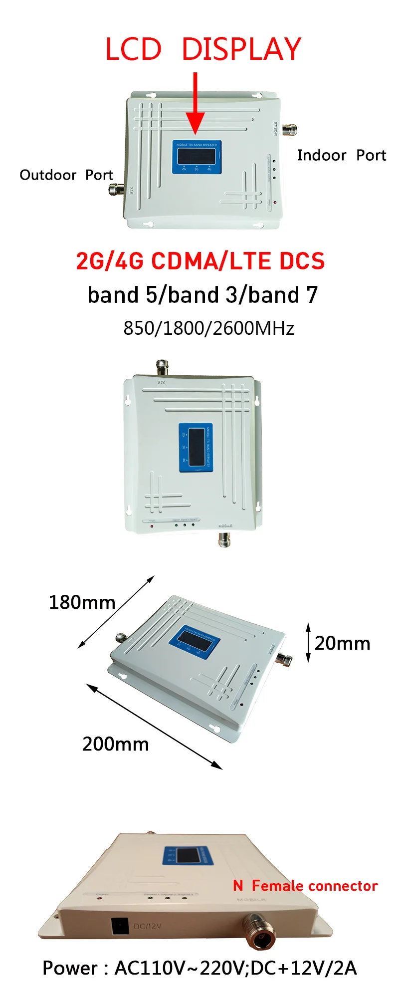 850/1800/2600 МГц 2G 3G 4G CDMA DCS LTE 4G ретранслятор сигнала GSM усиление 70 дБ сотовый мобильный усилитель сигнала трехдиапазонный 4G усилитель CDMA 850 МГц Частотный диапазон: Подключение: 824-849 МГц; Нисходящее Соединение: 869-894 МГц Диапазон частот LTE 2600 МГц: Uplink:2500-2570 МГц; Downlink:2620-2690 МГц DCS 1800 МГц Частотный диапазон: Подключение: 1710-1785 МГц; Нисходящее Соединение: 1805-1880 МГц Коэффициент усиления: 70 ± 2 дБ Как это работает: 1. Наружная антенна (антенна Yagi) получает сигнал от базовой станции. 2. Затем отправляет сигнал ретранслятору через длинный кабель 3. Ретранслятор получает сигнал и улучшает его. 4. После этого сигнал в внутреннюю антенну (панель/потолок/штыревая антенна), наконец, ваш мобильный телефон будет улучшаться.