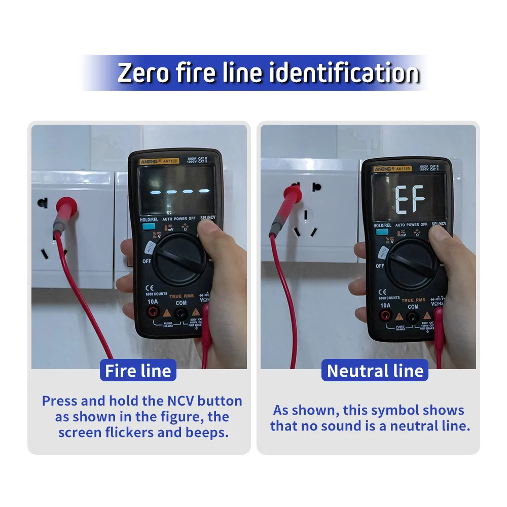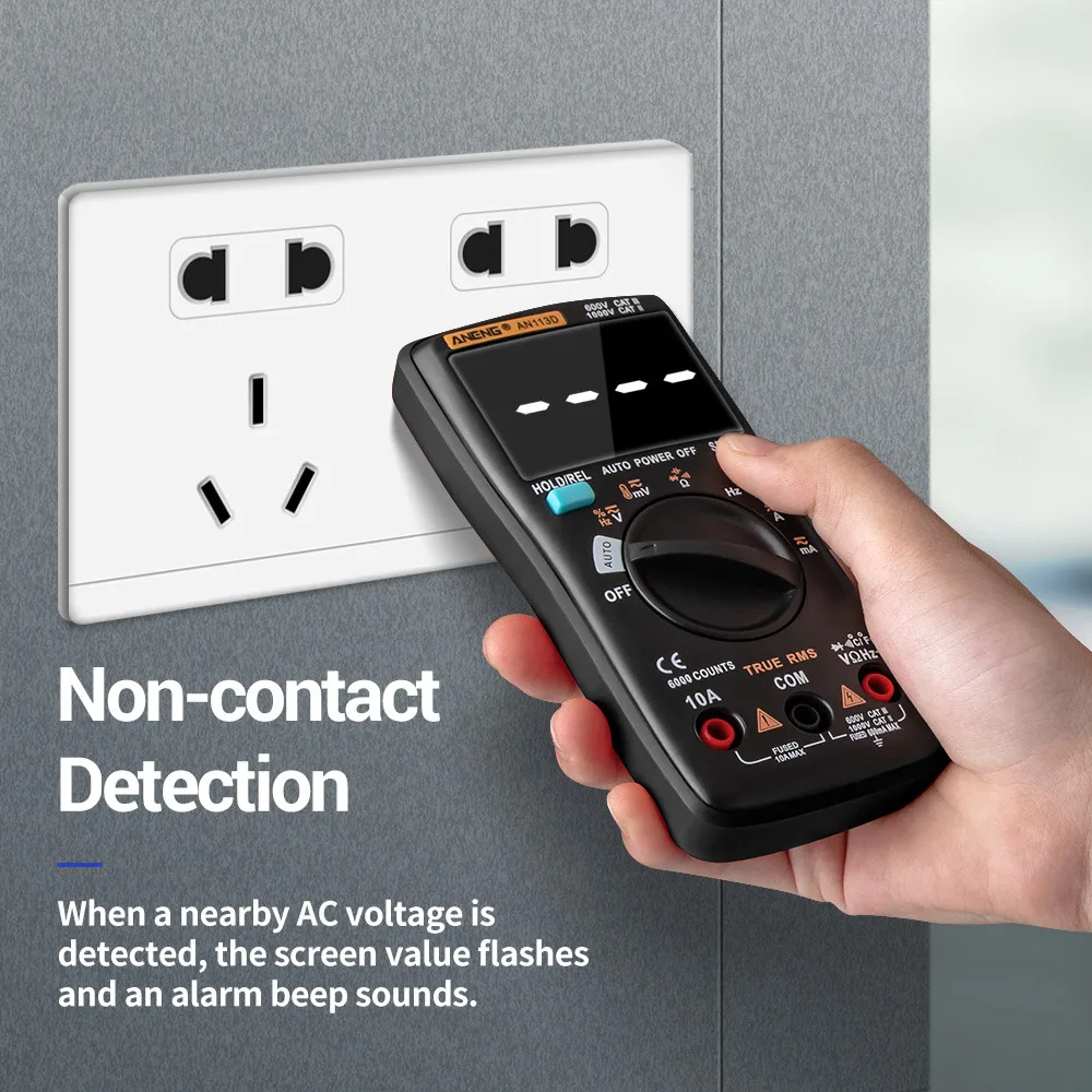 Встроенный датчик, поддерживает Бесконтактное обнаружение, при обнаружении рядом напряжения переменного тока, значение экрана мигает и звуковой сигнал тревоги.