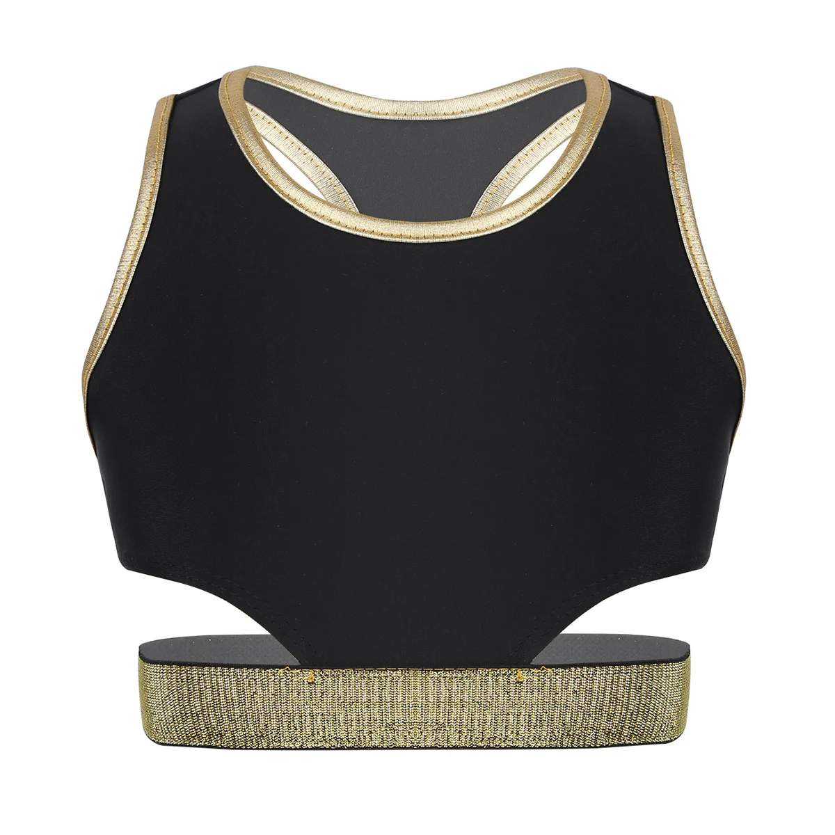 Без рукавов, с круглым вырезом. Борцовка. Вырезы с двух сторон. Блестящий эластичный подол помогает надежно удерживать верх на месте. Застежка на липучке.
