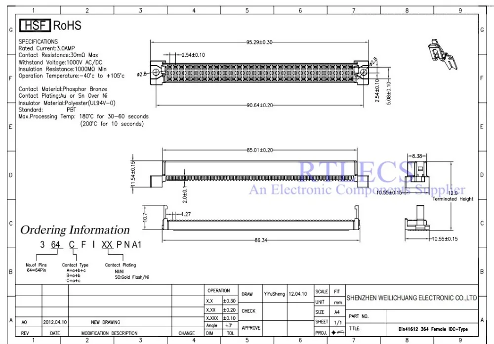 Разъем DIN 41612 3 ряда 64 положения женские шпильки IDC Тип 2x32 64Pin шаг 2,54 мм