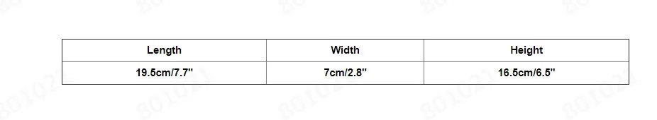 Размеры:19,5См (Д) x7см (Ш) x16.5 см (В)/7,7 (Д) x2.8 (Ш) x6.5 (в)"