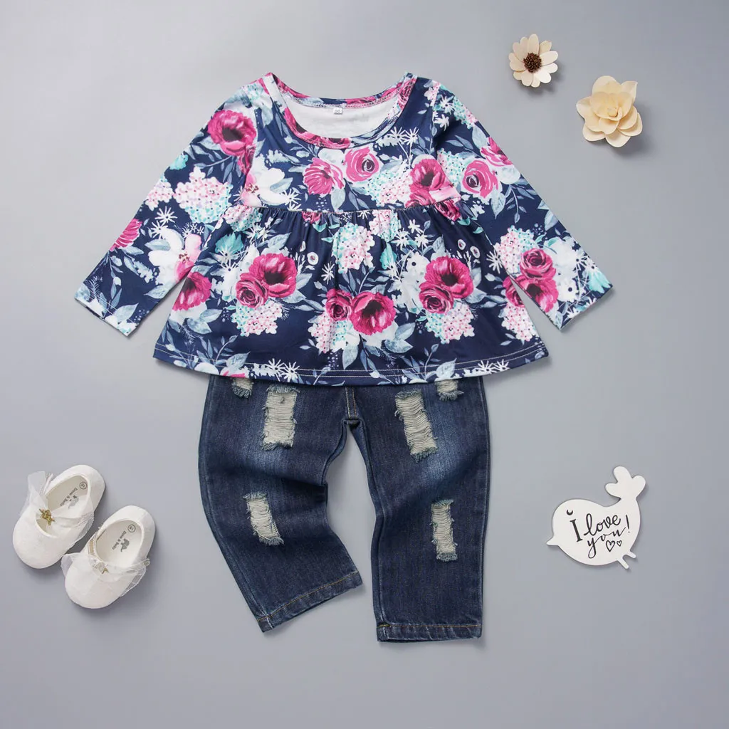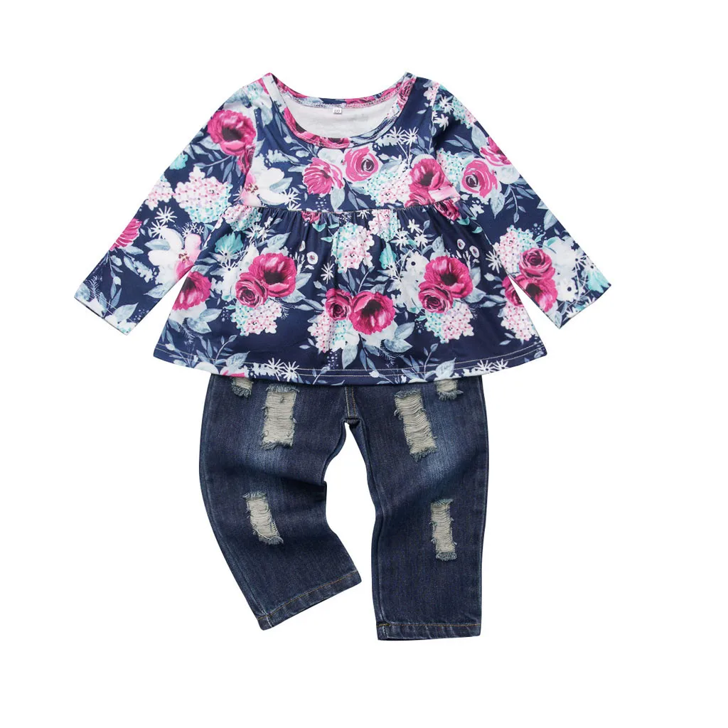 Топы с цветочным принтом для маленьких девочек, футболка, рваные джинсы, джинсовые штаны с дырками, комплект одежды