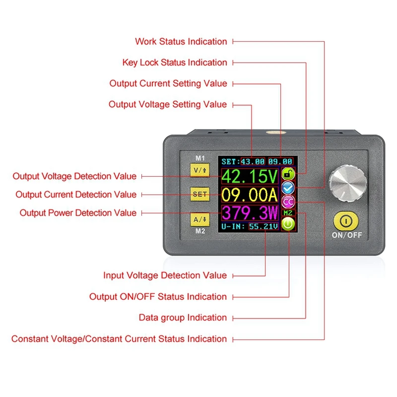 ЖК-дисплей на модуле имеет функцию цифрового вольтметра и амперметра. Вы можете просмотреть предустановленное напряжение, входное напряжение, выходное напряжение, предустановленный ток, выходной ток, выходную мощность и т. д.