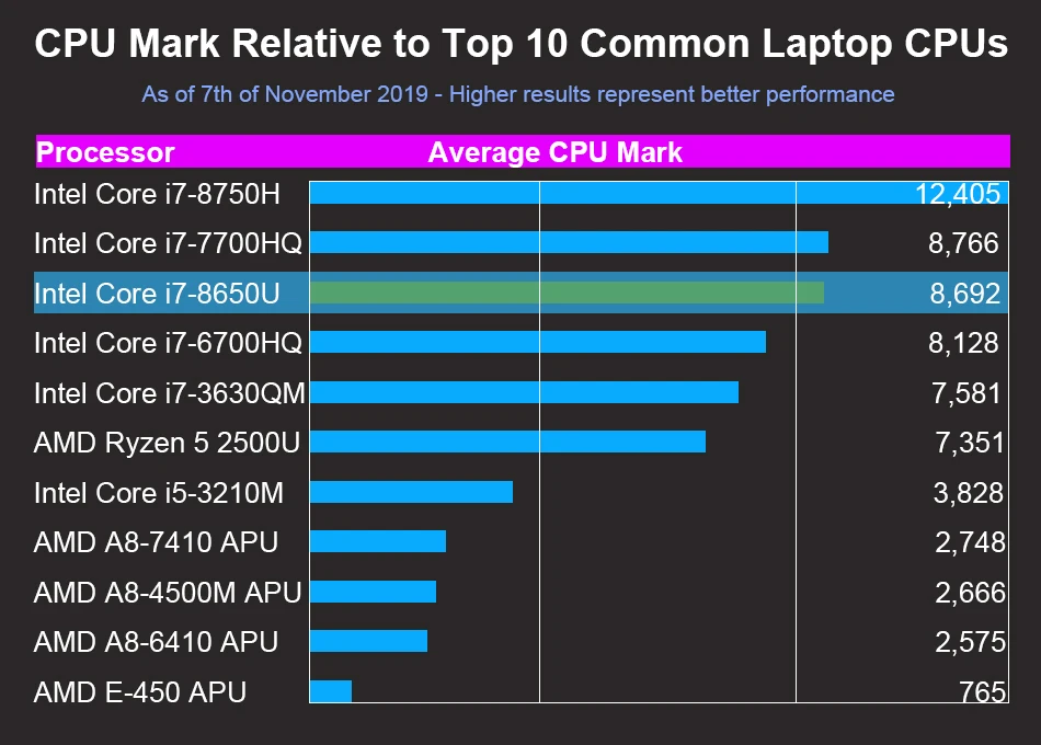 Intel Core i7 8650U ( 4 ядра 8 потоков, 1,90 ГГц, TDP: 15 Вт)