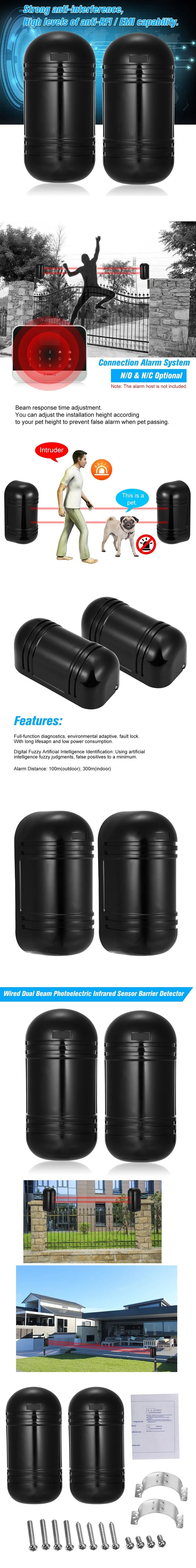 Этот проводной двойной луч, инфракрасный датчик является стабильным и надежным. При прерывании инфракрасного излучения реле будет выводить сигнал переключателя, он подходит для окна/двери/забора, парка, защиты по периметру двора и системы сигнализации в качестве анти-охранного обнаружения тела.