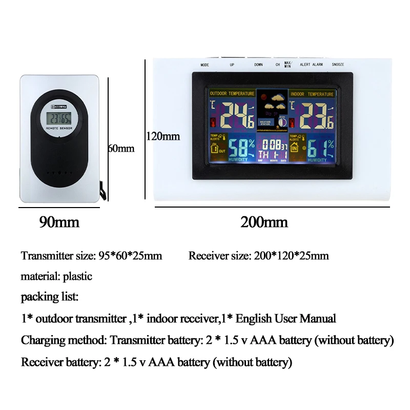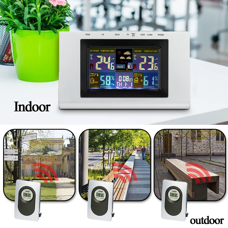 <Беспроводная передача: поставляется с погодостойким датчиком, который передает температуру и влажность на открытом воздухе для внутреннего приемника.