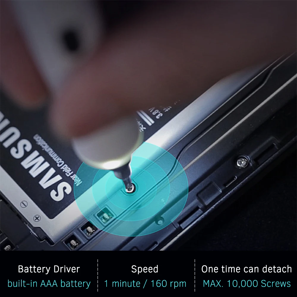 Управляется двумя встроенными сменными батареями AAA (посылка без аккумулятора), с высокоскоростным вращением для простой установки и отсоединения винта без повреждений.