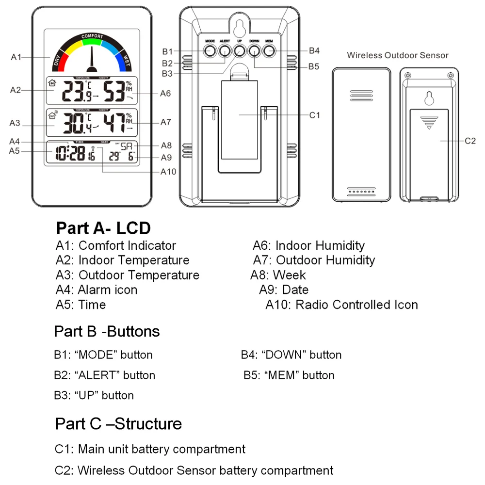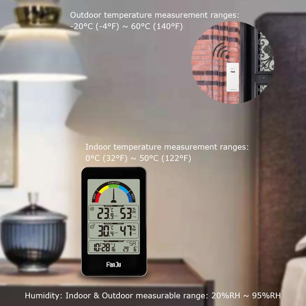 -Измерение влажности:Внутренний и наружный измеряемый диапазон: 20% RH ~ 95% RH. Высокая точность: 1% RH.