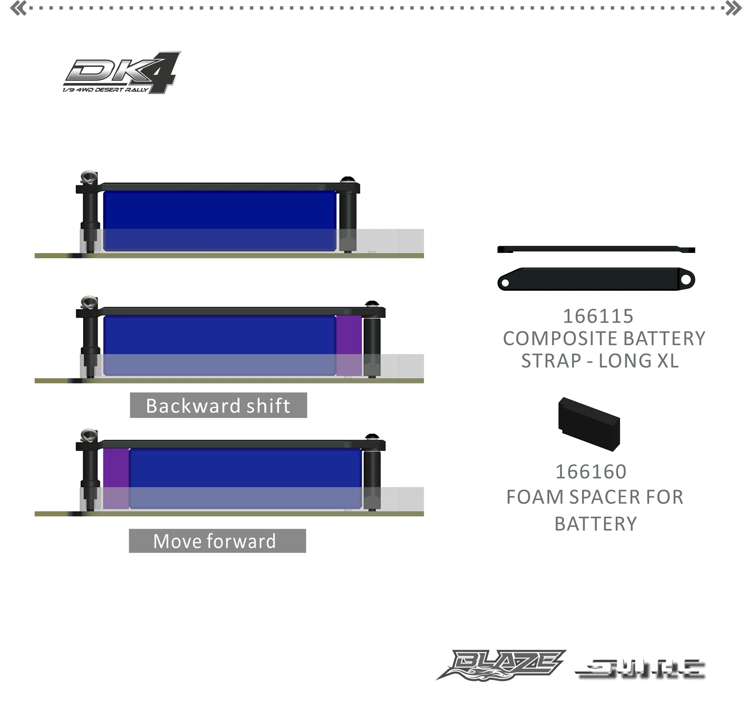 Ремни для аккумулятора доступны в двух вариантах длины. Длинный ремешок и ремешок X-Long. Используя ремешок для аккумулятора X-long, батарейный блок можно перемещать либо спереди, либо сзади. Это достигается для регулировки баланса веса автомобиля.