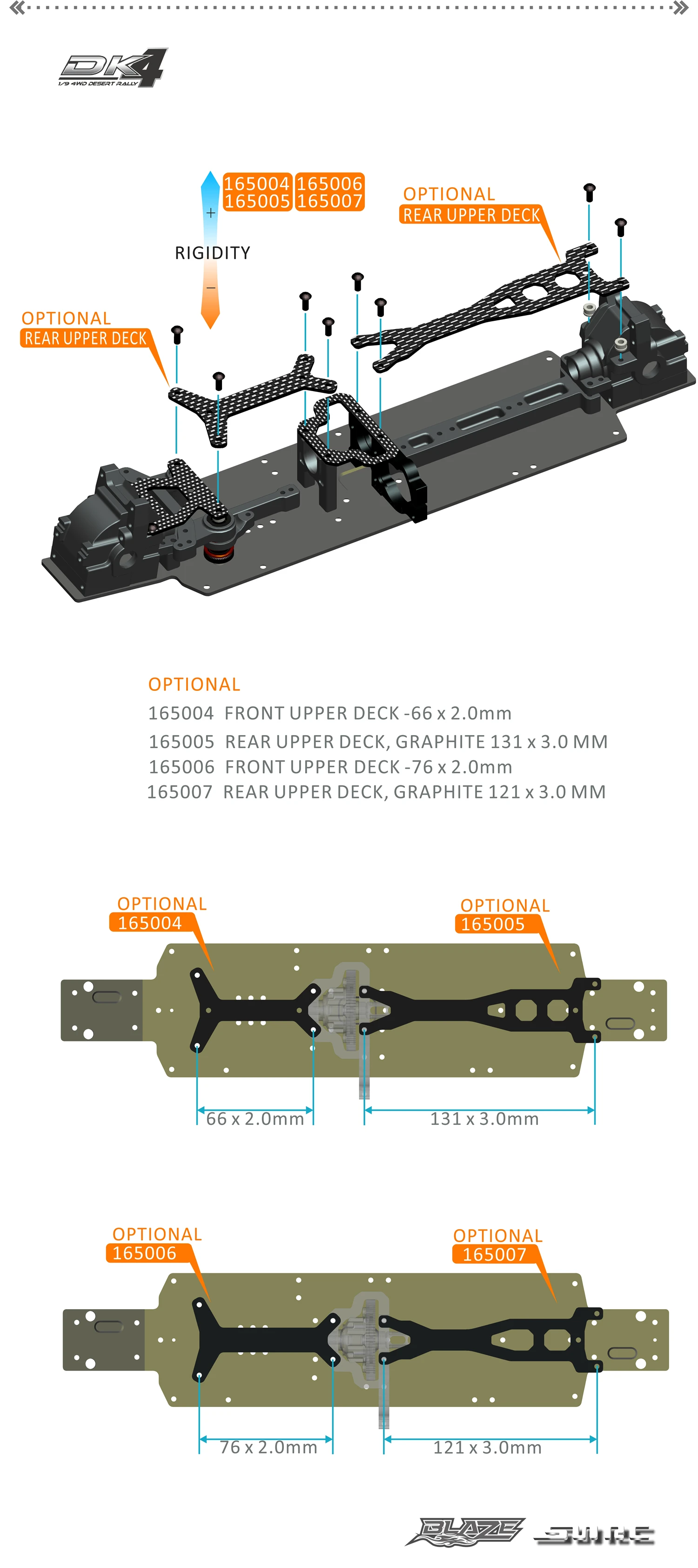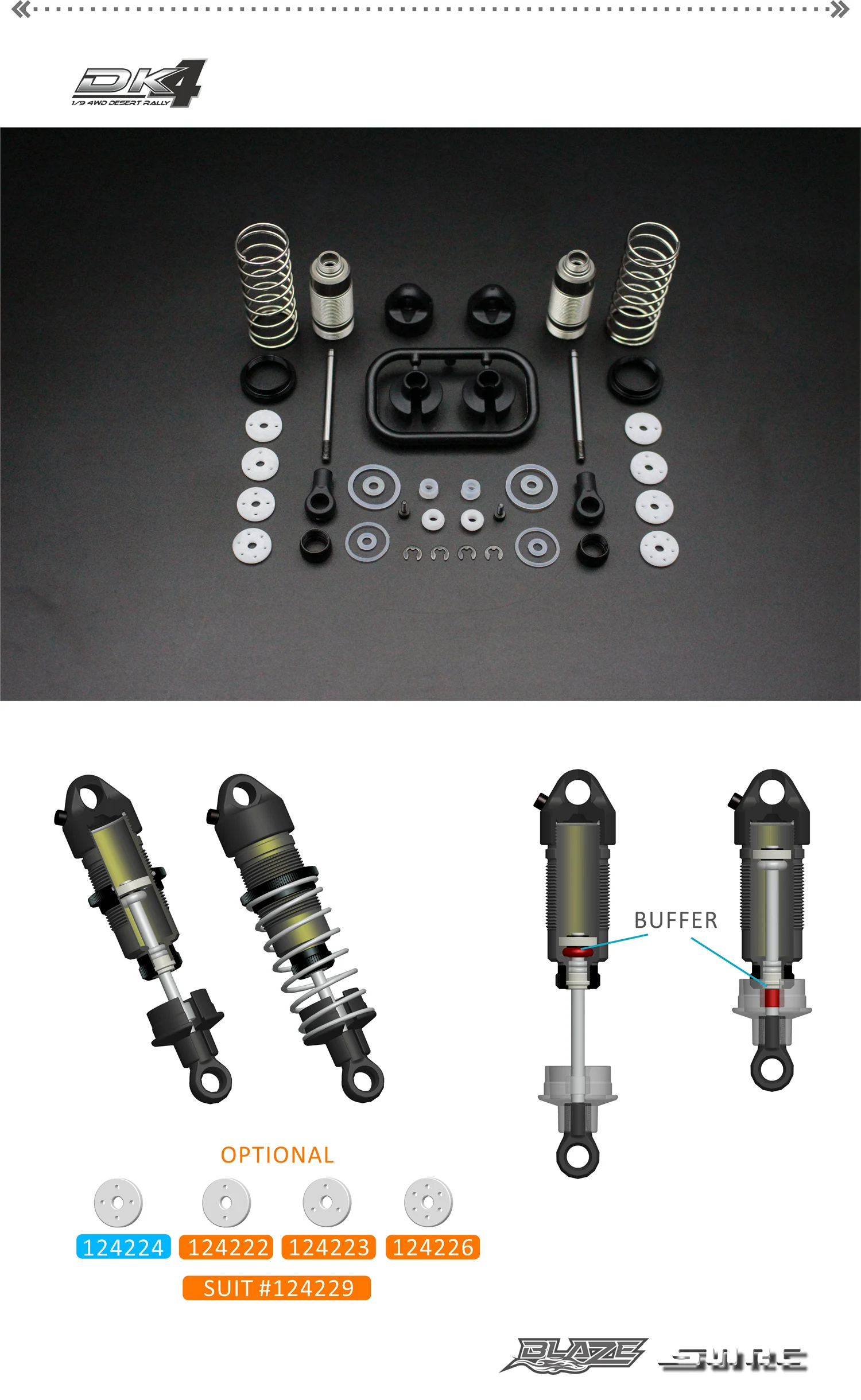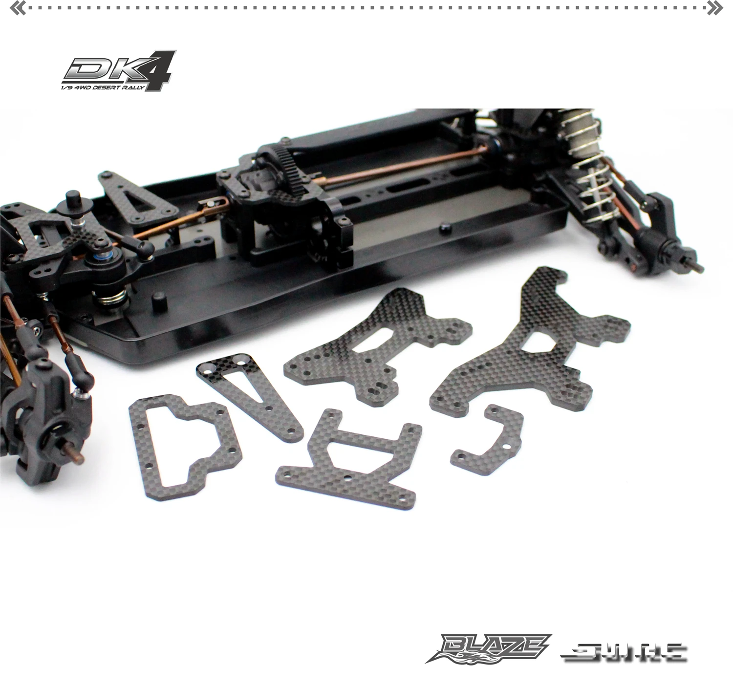 Многие части dk4 изготовлены из углеродного волокна, все из которых обрабатываются высококачественным углеродным волокном CNC. как передние, так и задние ударные башни разработаны с пористой регулировкой и изготовлены из высококачественного углеродного волокна CNC. Передняя ударная башня имеет толщину 3,0 мм, а задняя ударная башня-толщину 3,0 мм. Монтажными отверстиями предварительно настроены на Ралли стойка заранее.