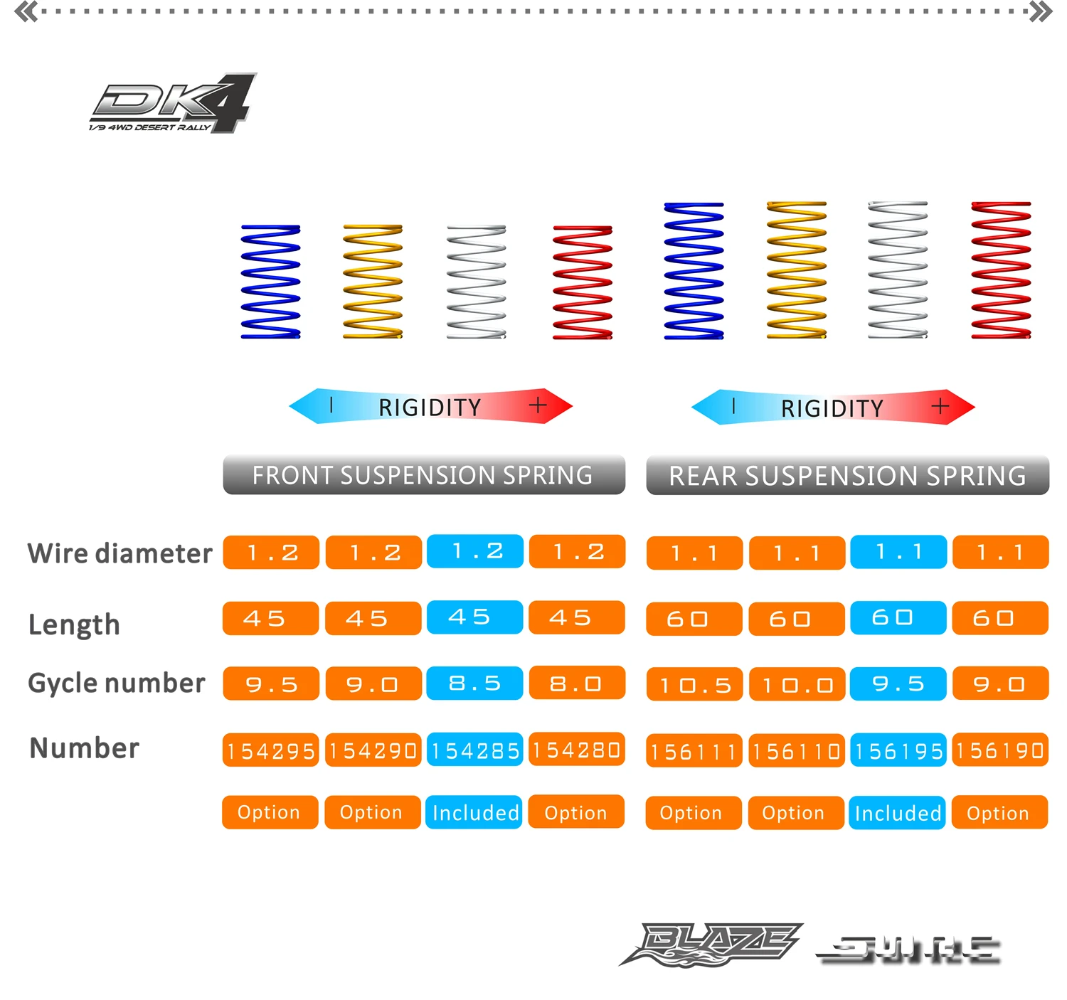 Передние и задние пружины доступны в 4 различных жгутах для выбора. Красный (мягкий), серебряный (средний), желтый (твердый), синий (супер жесткий).
