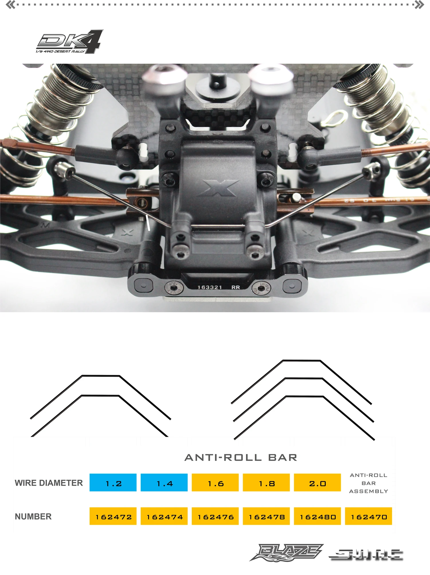 Кручение типа анти-ролл бар изготовлен из пружинной стали, которая используется для стабилизации переднего и заднего торцов автомобилей. И передняя и задняя анти-ролл бар одинакового дизайна. Для тонкой настройки могут быть заменены антирулонные стержни с различными диаметрами.
