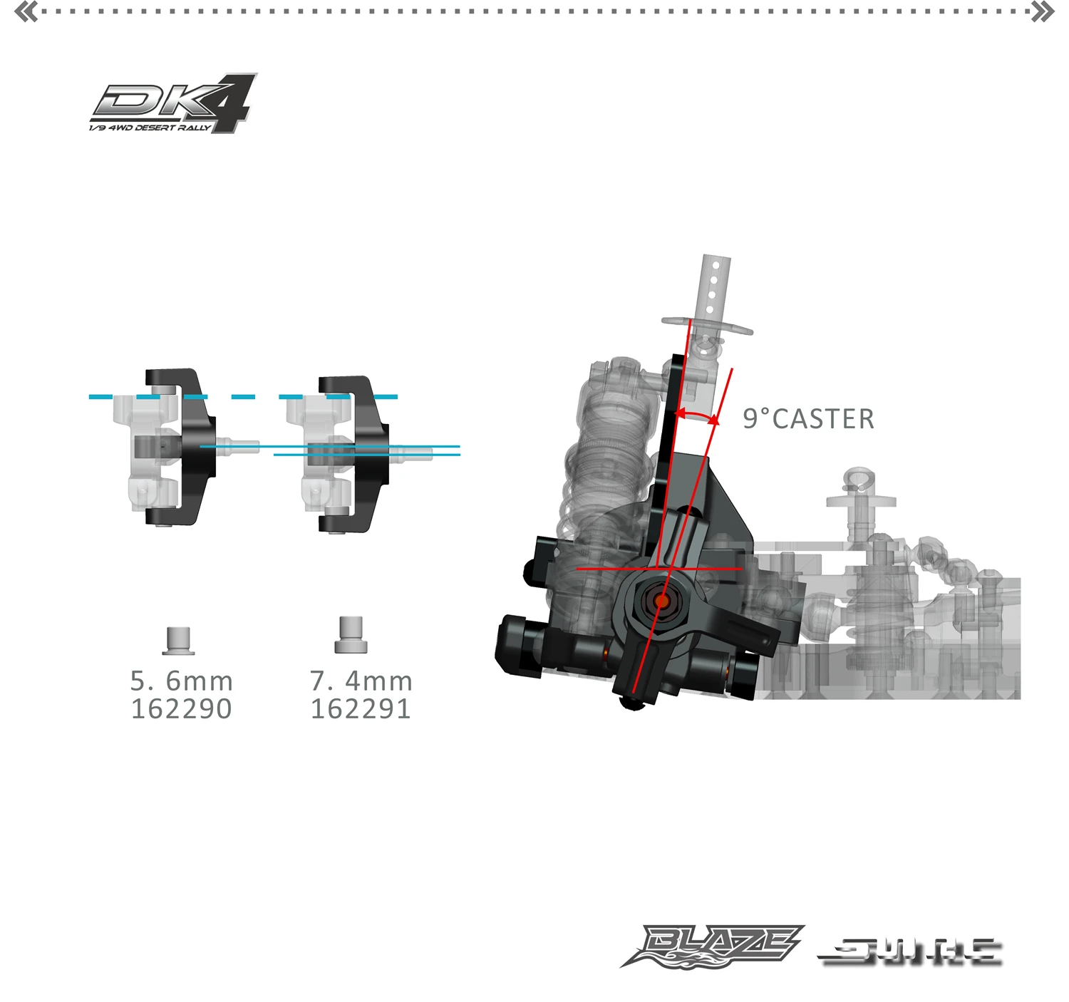 Рулевая втулка блок рулевого управления имеет разную длину. 7,4 мм (длинный) и 5,6 мм (короткий) соответственно. Путем изменения рулевой втулки, легко для более низкой регулировки центра крена и более высокой регулировки центра крена переднего колеса. оригинальные составные части XRAY, нерегулируемый угол наклона ролика предустановлен до 9 °. Используя различную толщину шимов, рицинус harndess и рицинус угол могут легко отрегулировать положение центра рулона.