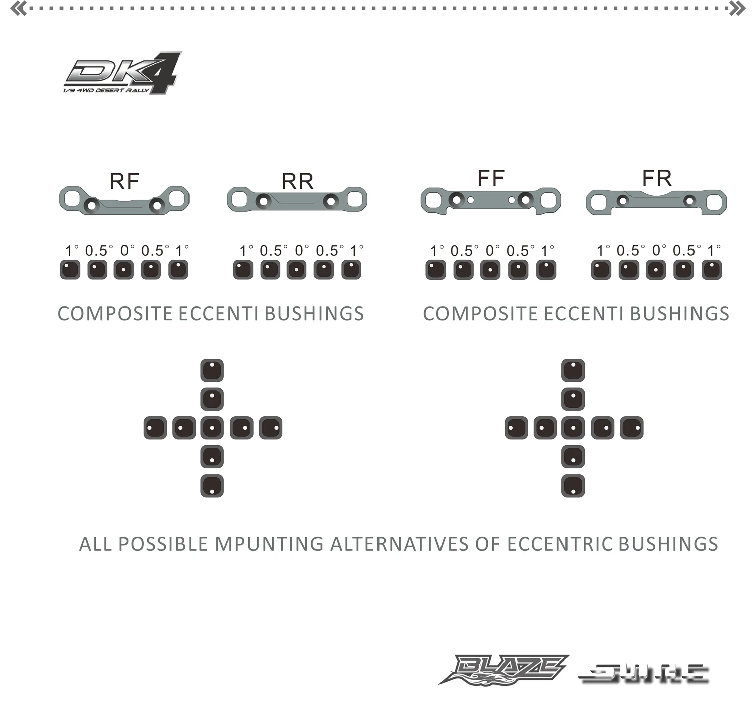Все алюминиевые держатели подвески в DK4 изготовлены из 6061T6 алюминиевого сплава с ЧПУ, толщиной 5 мм, что обеспечивает супер быструю, легкую и удобную геометрию подвески. путем изменения или использования различных эксцентриковых втулок, рычаг подвески может быть хорошо отрегулирован его передний и задний носок-в, передний и задний рулон-центр, колесная база, ролик, Развал .. и т. Д. И другие геометрические структуры.