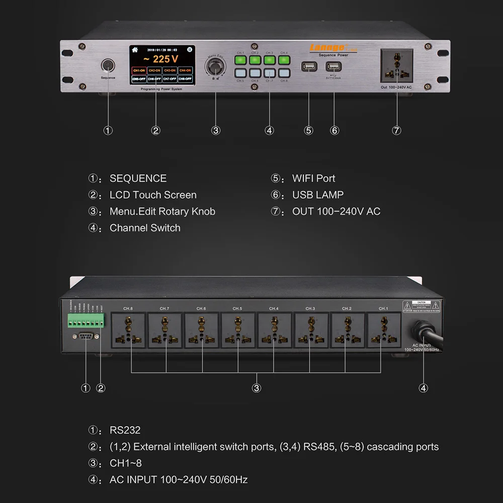 8 каналов вывода, время задержки загрузки и выключения каждого канала может быть установлен (диапазон: 0 ~ 999sec).