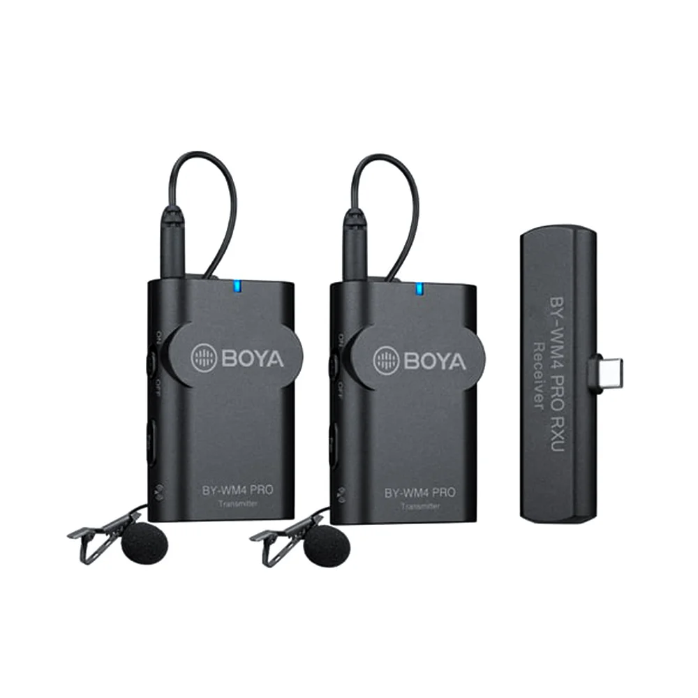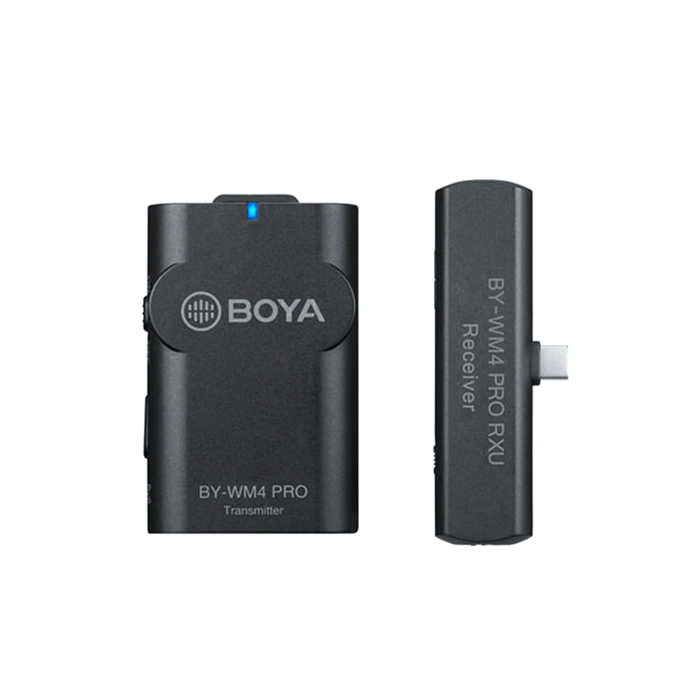 BY-WM4 PRO-K5: Легко использовать для Android и других устройств Type-C, состоит из передатчика корпуса (TX4 Pro) И миниатюрный приемник с разъемом Type-c (BY-WM4 PRO RXU), один всенаправленный микрофон lavalier.