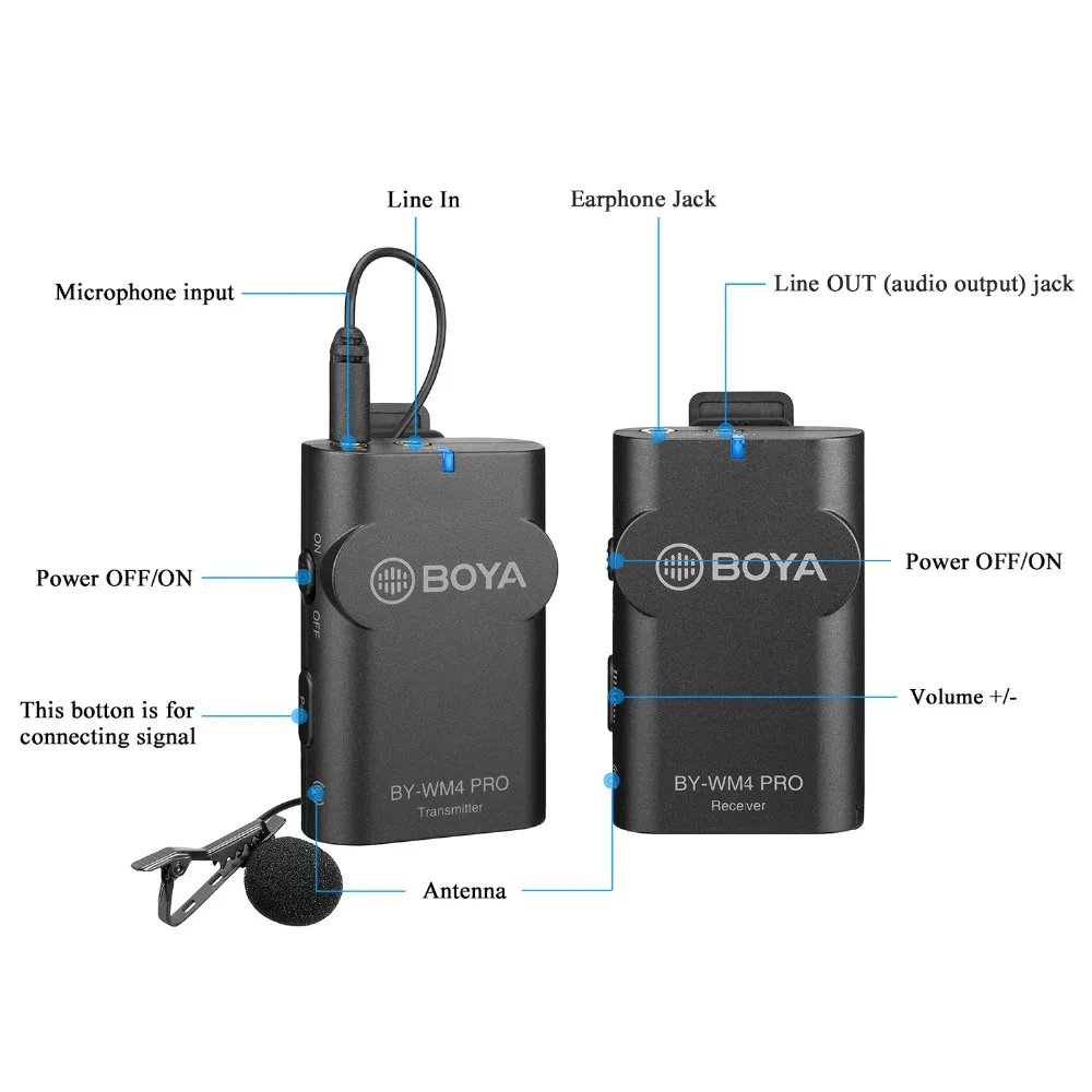 BY-WM4 Pro-K2:Состоит из двух компактных передатчиков (TX4 Pro), портативного приемника (RX4 Pro), петличный микрофон/отворот, двух частей всенаправленных лавальских микрофонов, 3,5 мм TRRS аудио кабель и 3,5 мм TRS аудио-кабель.