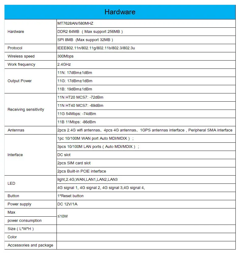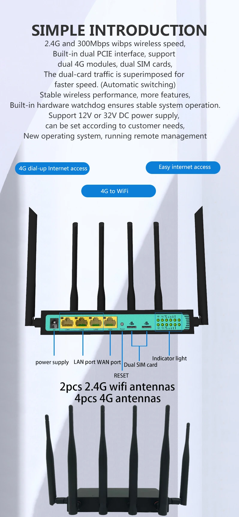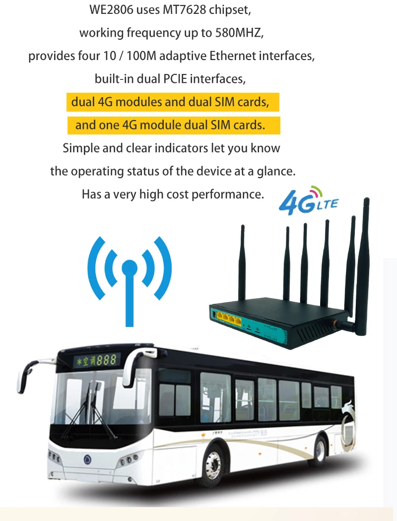 WE2806 принимает схему MT7628NN, с основной частотой 580 МГц, оснащен большой емкостью DDR2 RAM и высокоскоростной SPI Flash, и до 2,4G беспроводной сети 300 Мбит/с. Обеспечивает пять адаптивных интерфейсов Ethernet 10/100 м, встроенный двойной интерфейс PCIE, dual-4G модуль с двумя sim-картами, также может поддерживать single-4G модуль с двумя sim-картами, лаконичный светильник индикатора, может понять состояние работы устройства с первого взгляда. Он имеет высокую производительность-соотношение цены и качества.