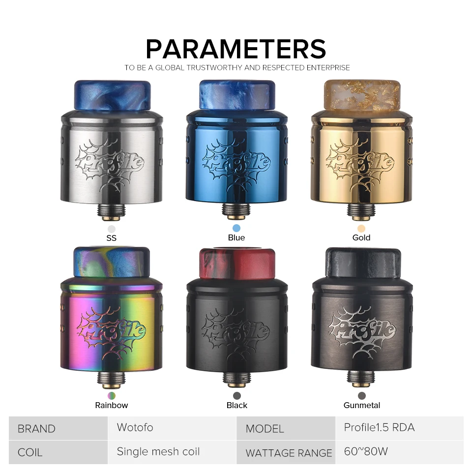 Инструкции: Profile1.5 RDA от WOTOFO-это Модернизированная версия профиля RDA, она поставляется с тремя различными катушками на выбор, включая nexMESH CHILL A1 0,15 Ом, nexMESH TURBO A1 0,13 Ом и nexMESH EXTREME A1 0,16 Ом. RDA отличается максимальным потоком воздуха, более низким потоком воздуха и гибким подачей воздуха, который поддерживает односетчатую катушку и обеспечивает быстрый нагрев и усиление вкуса. Совместим с модом Squonk style и обычным модом. Это правильный RDA для вас, чтобы насладиться идеальным вкусом и облачным паром. Характеристика 1. Улучшенный профиль RDA, быстрый нагрев и усиление вкуса 2. Максимальная подача воздуха, более низкая подача воздуха и гибкая подача воздуха на выбор 3. Катушка nexMESH CHILL/nexMESH TURBO/nexMESH EXTREME 4. Включение лучшего аромата, при этом простое 5. Новый дизайн с двумя капельными наконечниками 810 Технические характеристики Диаметр корпуса RDA: 24 мм Диаметр колоды: 22,5 мм Общая высота: 33,1 мм (С капельным наконечником и 510 pin) Катушка: одна сетчатая катушка Диапазон мощности: 60 ~ 80 Вт Цвет: черный, SS, металл, золото, синий, Радуга Упаковочный лист 1 x профиль 1,5 RDA 1 x Руководство пользователя 1 шт., дополнительный капельный наконечник 1 х гибочный инструмент 1 х сумка для аксессуаров Шестигранный ключ-1 шт. 1 отвертка с крестообразной головкой 3x6 мм Толстая х волоконная хлопковая лента 1 x nexMESH CHILL A1 0,15 Ом 1 x nexMESH TURBO A1 0,13 Ом 1 x nexMESH EXTREME A1 0,16 Ом 1x10 шт., катушка nexMESH