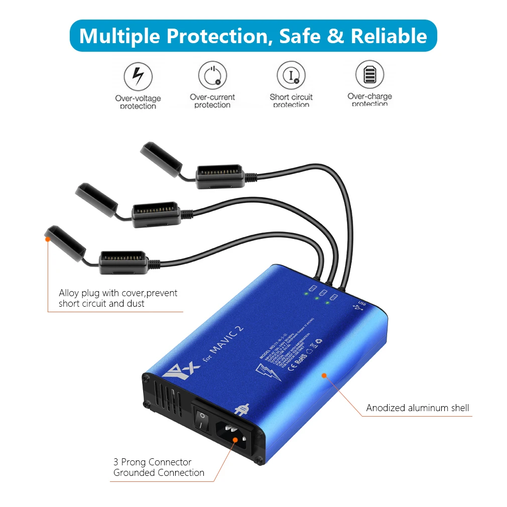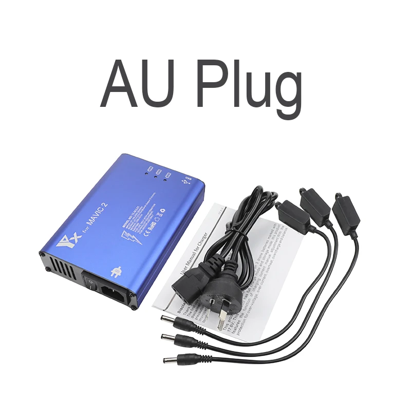 -Подходит для DJI Mavic 2 Pro Zoom drone battery charging, -Он может заряжать 3 батареи и 2 usb-интерфейса одновременно -Для одновременной зарядки 3 аккумулятора требуется около 65 минут -Встроенный выключатель питания, интеллектуальный контроль заряда, -Зарядный кабель может быть отключен по желанию, удобен для переноски и хранения, -Есть четыре вилки на выбор: штепсельная вилка США, штепсельная вилка Великобритании, штепсельная вилка европейского стандарта, штепсельная вилка австралийского стандарта