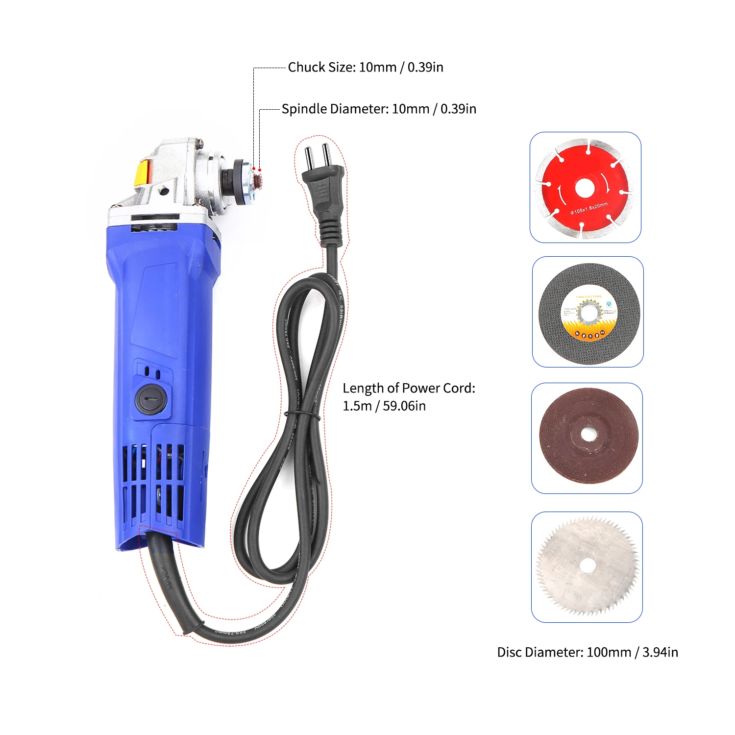 -Алюминиевый нос с шпиндельным замком: прочный алюминиевый материал. Кнопка блокировки шпинделя делает его более удобным и эффективным для вас, чтобы изменить шлифовальные диски во время работы.