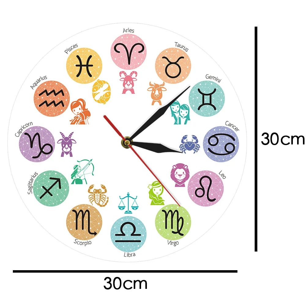 Вы ищете красивые настенные часы? Это может быть ваш шанс получить его. Настенные часы со знаками Зодиака-это качественный принт жикле, который имеет яркие цвета, которые сохранят свой цвет на долгие годы. Лицо напечатано на акриловой пластине. Края красиво обработаны. Вы оцените твердое качество и ощущение этих красивых часов. Это даже может быть идеальным украшением для вашей комнаты или полок, если вы хотите. Вы можете использовать его дома, в офисе или в любом месте, где вы хотите его положить. Этот предмет делает уникальный акцент в качестве полезного, декоративного хронометра.