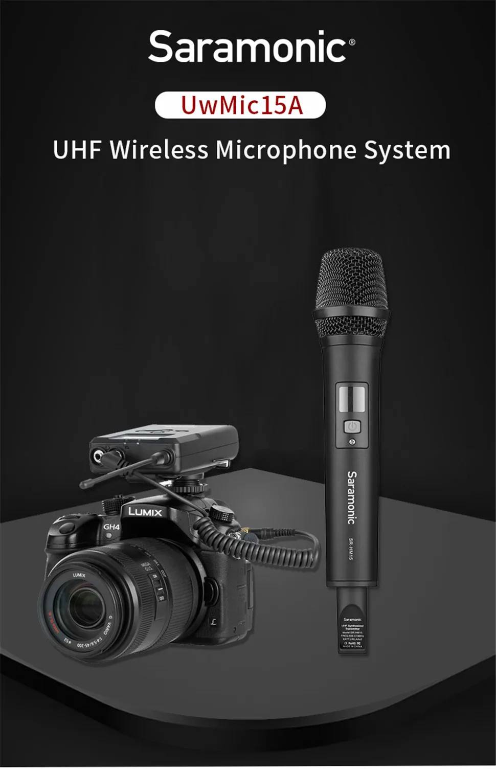 Беспроводная микрофонная система Saramonic UwMic 15A UHF предназначена для беспроводной работы через порт, такой как DSLR видео и приложения для записи на поле, эта посылка включает в себя приемник RX15 и ручной микрофонный передатчик SR-HM15