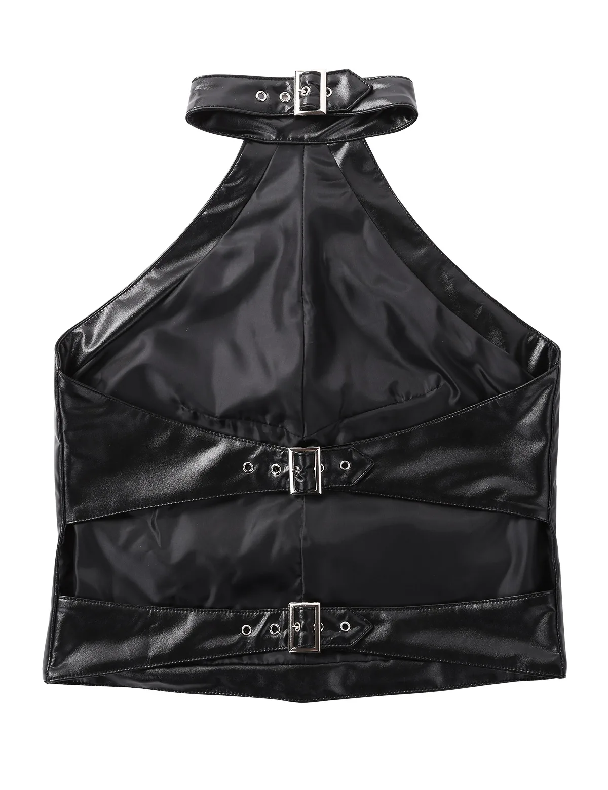 Women's wet look искусственная кожа buckled безрукавки жилет rave одежда для танцевального клуба, slim fit.
