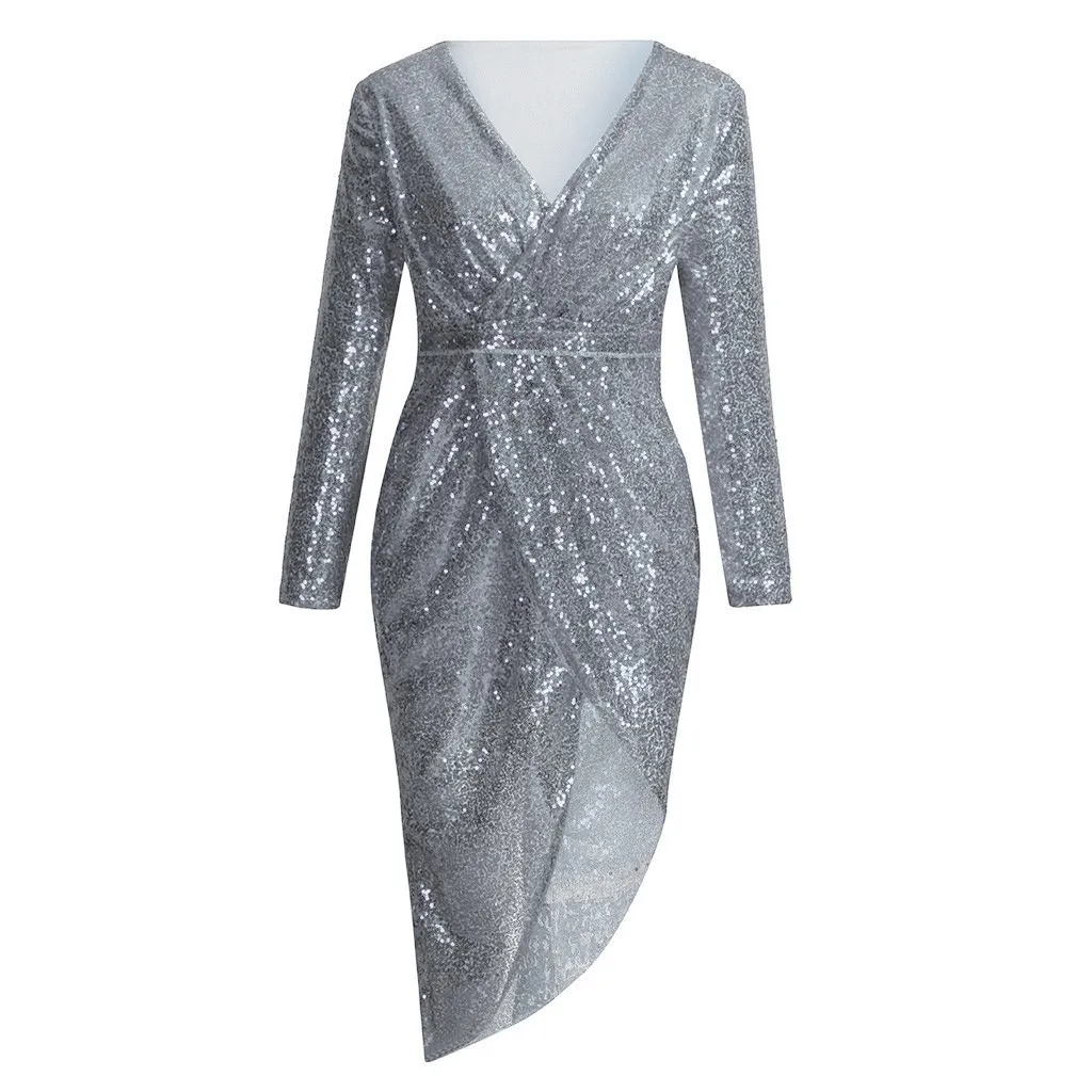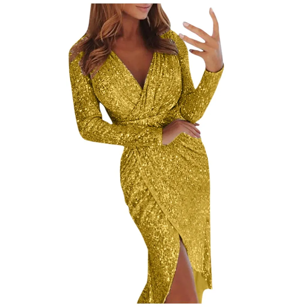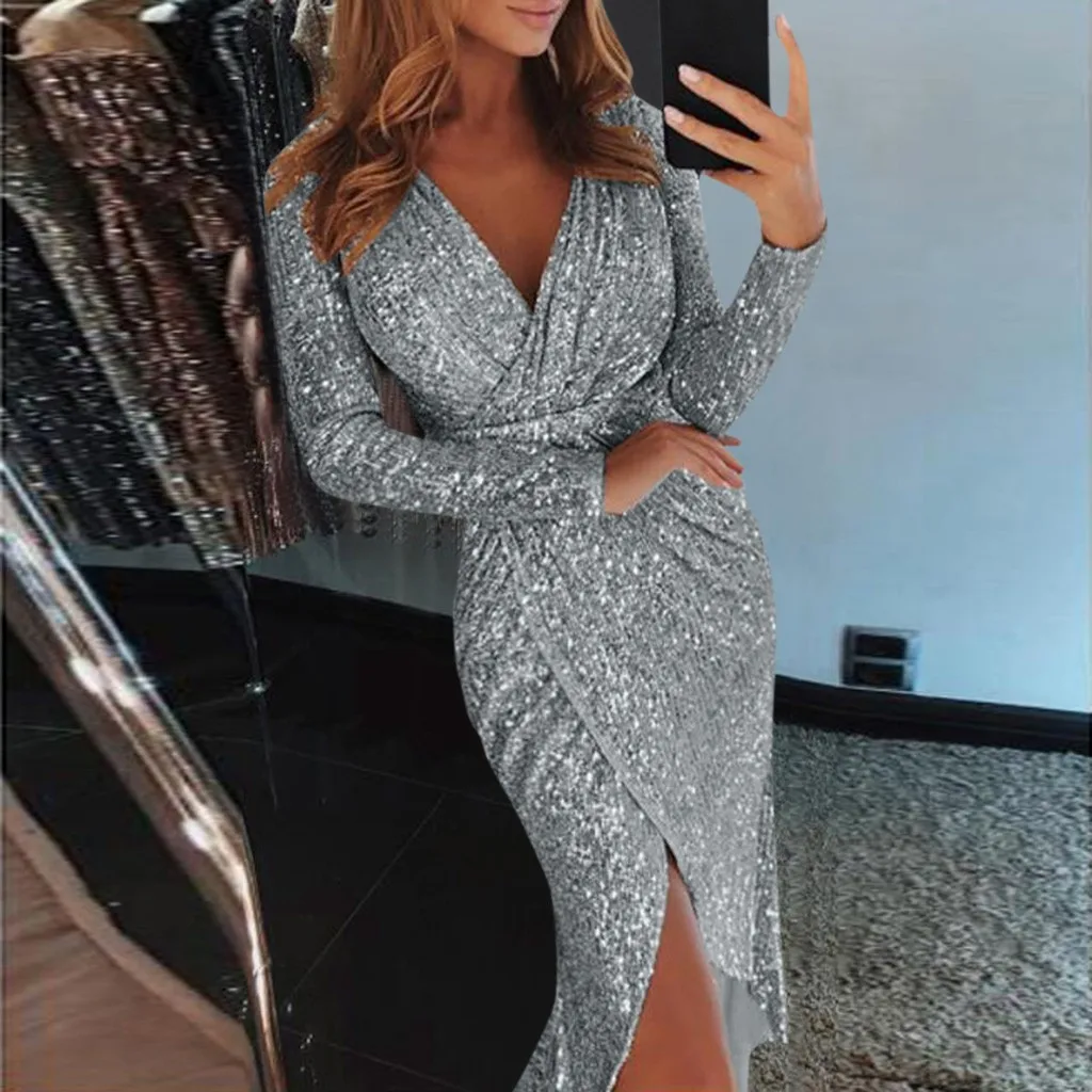 Женское сексуальное платье с глубоким v-образным вырезом, с блестками, с длинными рукавами, вечернее платье, платье для ночного клуба