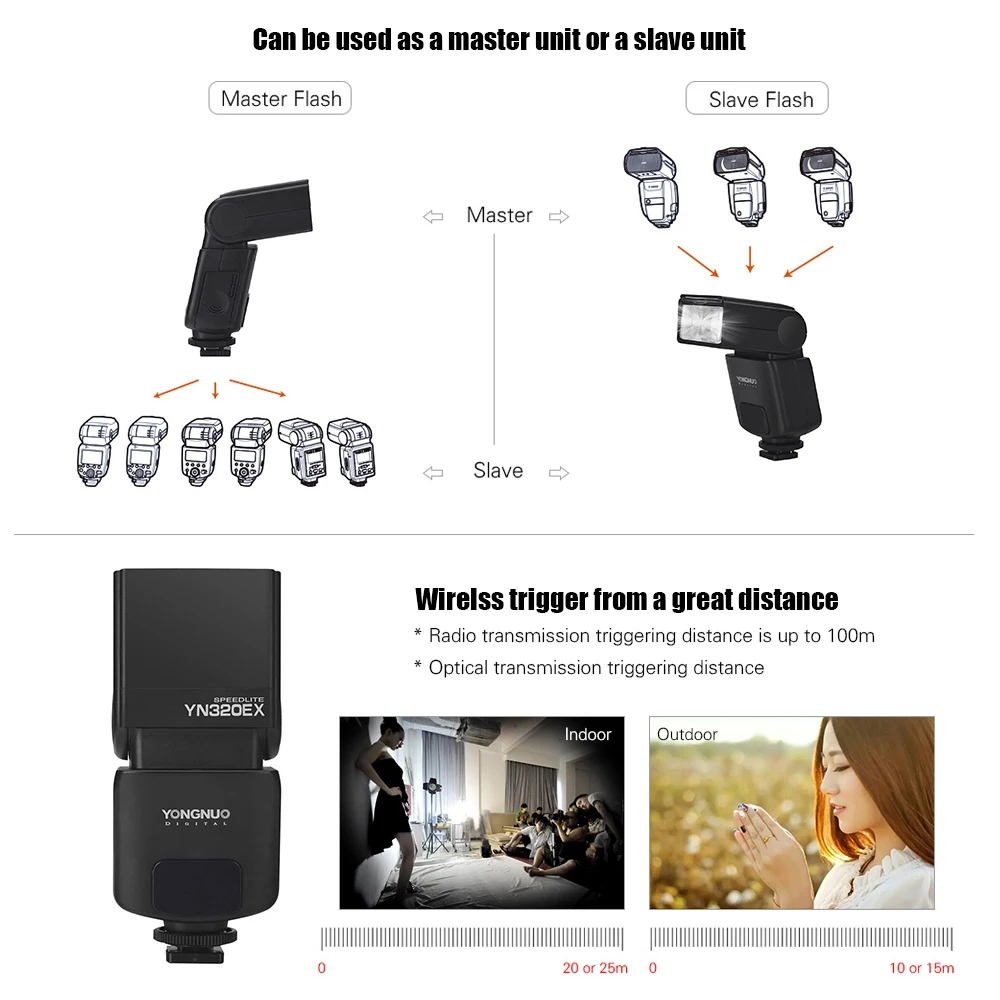 Особенности: Беспроводной передатчик-приемник, поддержка радиозапуска 2,4G и оптического запуска: -YN320EX совместим с сигналом радиозапуска YONGNUO RF602/RF603 и беспроводным сигналом беспроводной передачи Sony, и может использоваться в качестве главного блока или подчиненного устройства. Высокоскоростная синхронизация TTL speed lite и Сверхбыстрая система рециркуляции зарядки: -YN320EX поддерживает TTL flash и высокоскоростную синхронизацию (HSS). Максимальная скорость синхронизации до 1/8000 с; Время рециркуляции для полного выхода занимает всего 2 с, высокая скорость зарядки повторного использования для вас. Может осуществить 6-группа вспышки Управление легко: -Как радиомастер, YN320EX поддерживает управление 6 отдельных групп. Он может удаленно управлять режимом вспышки, выходом вспышки, фокусным расстоянием, количеством стробоскопических и стробоскопических частот YN560Li/Yn720/YN685/YN560III/YN560IV/YN660/YN860Li. Звуковая система подсказки и головка вспышки Электрический зум: -Когда система звуковых подсказок включена, вспышка излучает различные звуки, чтобы указать различный рабочий статус; С помощью кнопки ZOOM, головка вспышки может циркулировать в диапазоне покрытия 24 мм-105 мм. Обновление прошивки USB: -- YN320EX оборудован с USB портом для зарядки. Последняя версия прошивки может быть Скачать с Светодиодная лампа для видеосъемки YONGNUO официальный веб-сайт. Обновите прошивку YN320EX, чтобы сохранить ее в лучшей производительности. Параметры: Руководство №: 31(ISO 100105 мм) Модель Вспышки: TTL, M, Multi Режим запуска: On-Camera, 2,4G радио триггер, Беспроводной Оптический триггер Диапазон зума: 24, 50, 70, 105 мм Вертикальный угол поворота: от-7 до 90 градусов Угол горизонтального вращения: 0-270 градусов Источник питания: 2 * AA щелочной батареи или AA Ni-MH батареи (не включены) Время вспышки: прибл. 220 раз Время рециркуляции: прибл. 2 секунды (с батареей AA Ni-MH) Цветовая температура: около 5600K Время вспышки: 1/350 с до 1/20000 с Управление вспышкой: 8 уровней управления выходом (1/128-1/1), 22 уровня тонкой настройки в общей сложности Внешний интерфейс: горячий башмак, порт Micro USB Дальность передачи: 20-25 м в помещении, 10-15 м на открытом воздухе для Фото чувствительных, до 100 м для радио запуска Дополнительные функции: Электрический зум, звуковая подсказка, энергосберегающий режим, защита от перегрева, автоматическое сохранение Товар Размеры: 4*6,5*15,4 см/1,6*2,6 * 6.1in Вес изделия: 225 г/7,9 унций Посылка Размеры: 19,5*9,5*8,5 см/7,7*3,7 * 3.3in Посылка Вес: 400g/14,1 oz Примечание: В многомодовом/Радио режиме вспышки/S1/S2 режим беспроводной вспышки, HSS не поддерживается. Посылка список: 1 * Flash YN320EX 1 * защитный мешок 1 * Мини-подставка 1 * Руководство пользователя (английский и китайский) 1 * ручка для объектива (бесплатный подарок) 1 * отражатель (бесплатный подарок) 1 * салфетка для чистки Zomei (бесплатный подарок) 1 * Цветной фильтр вспышки (бесплатный подарок)