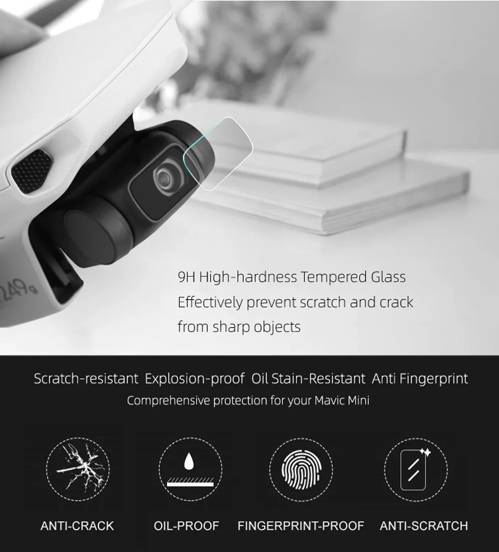9H высокотвердое закаленное стекло эффективно предотвращает царапины и трещину от острых объектов 2.5D Arc edge process Обеспечивает ровный подшипник и гладкие края Высокое разрешение и неразрушающее качество Защита от стеклоочистителя и скребка эффективно защищает объектив MAVIC Mini Размер точный нано Адсорбция стабильный склеиваниеПосылка включает в себя: