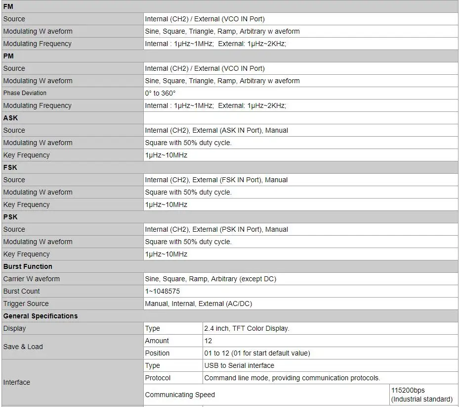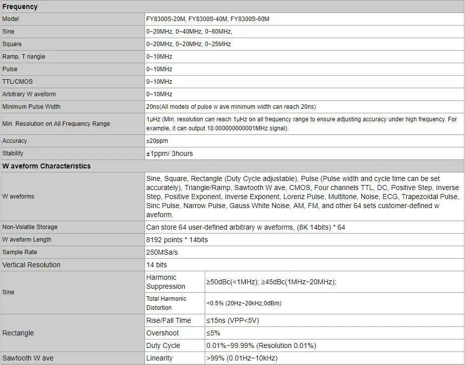 Используйте технологию прямого цифрового синтезатора (DDS) и Обеспечьте стабильные, точные, чистые и низкие сигналы искажений. 2,4 дюймов TFT Цвет ЖК-дисплей с 320 × 240 Разрешение, отображение параметров и графикой из трех каналов в одно и то же время. Рабочий стол дизайн ABS пластиковый чехол принят, использовать 100-240 В (AC) Широкий диапазон напряжения питания. Прибор использует 14-bit высокоскоростной D/A конвертер чип (5Vpp выход дискретизации погрешность составляет менее 1mV), 250MSa/s частота дискретизации, 14 бит в вертикальном направлении. Нажатие кнопки OK в течение длительного времени в процессе использования может быстро сохранить информацию о параметрах текущего выхода инструмента, и сохраненные параметры могут быть автоматически загружены на следующую загрузку. Независимый трехканальный выход (эквивалент трех независимых источников сигнала) может работать синхронно и разница в фазе может быть точно отрегулирована. С функцией отслеживания каналов все параметры трех каналов могут быть обновлены в соответствии с конфигурацией пользователя одновременно при открытии трекинга. Выходы поддерживают до 100 групп функций/произвольный w aveform, содержит 33 группы предустановленных w aveforms и 64 группы опеределяемый пользователем w aveforms. Предустановленных w aveforms: Синусоидальная, квадратная (рабочий цикл регулируется), импульса (длительность импульса и время цикла может быть комплект точно), T riangle/рампы, КМОП-матрица (0 ~ 12V) показательные, показательные, Шум, ЭКГ, DC и т. д. Позволяет хранить 64 произвольных w aveform файлы данных, каждый из w aveform глубина хранения 8192 точек * 14 бит. Развертки Функция: он может развертки 4 свойства сигналами, в том числе частота, амплитуда, смещение и длительным сроком службы; Он имеет линейный и логарифм два развертка типа; 0,01 S ~ 999,99 S Время развертки; Вверх, вниз и круглый ход Поддержка два или более генераторы сигналов произвольной формы подключен к достижению многоканальный выход, максимальный Поддержка 16-канальный синхронный выход, участок между каждый канал может быть отрегулировано. Функция сохранения: он может сохранить 12 наборов пользовательских параметров и может быть загружен в любое время. Функция связи: все функции могут контролироваться программой ПК, а Протокол связи открыт для вторичного развития. Выход защита от короткого замыкания Защита от: все каналы может работать более чем 60 секунд в тех случаях, когда нагрузка короткого замыкания.