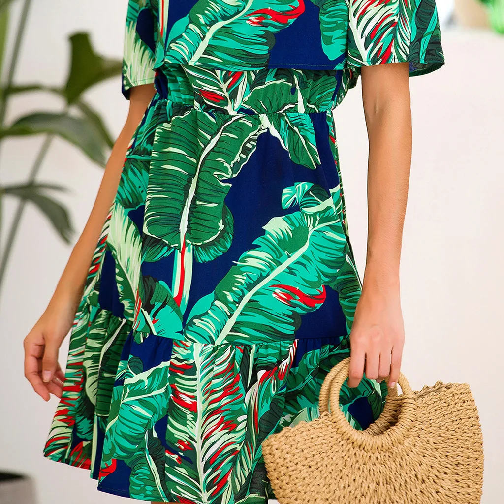 Женское повседневное мини-платье с принтом в виде листьев, свободное платье с открытыми плечами и бантом на поясе