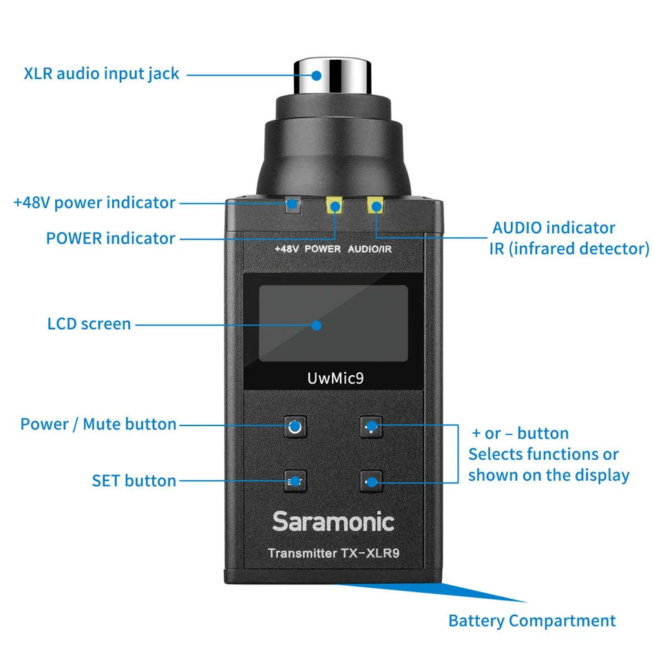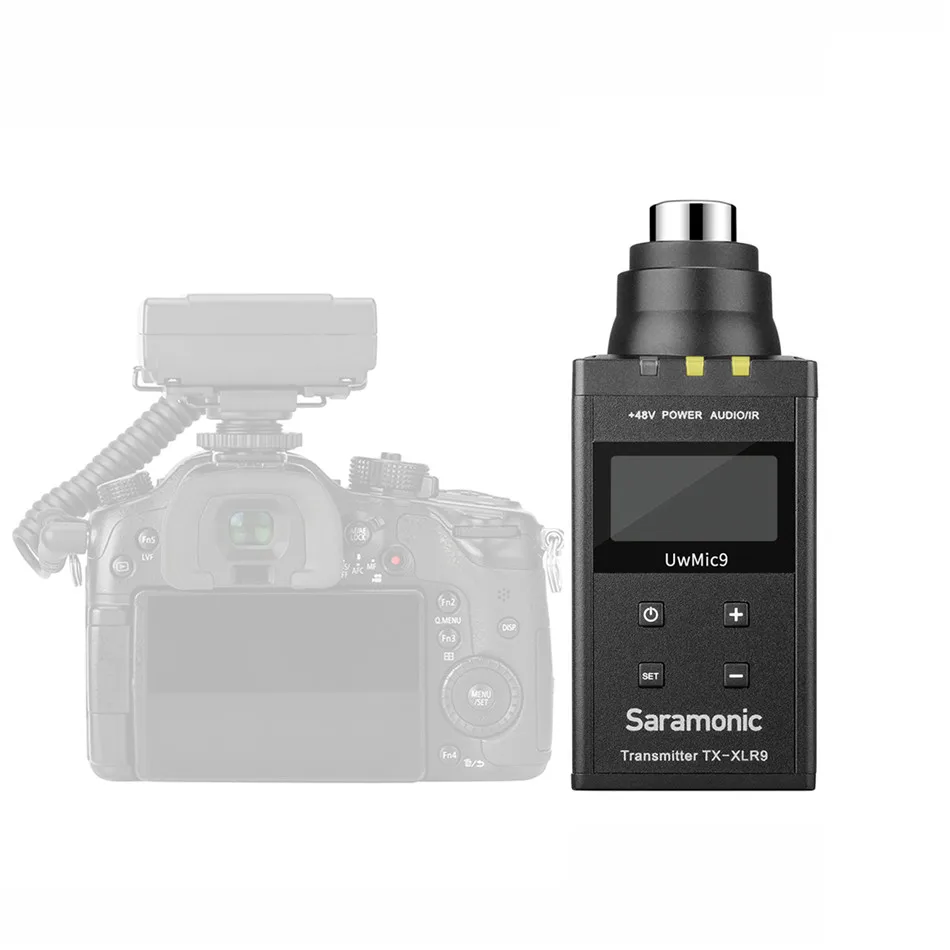 Компактный передатчик типа plug-on XLR TX-XLR9 Saramonic UwMic9 является компактным разъемом XLR. Он имеет широкий переключения RF пропускная способность, легко читаемый ЖК-дисплей дисплей, + 48В и беззвучный режим. Он подходит для портативной беспроводной работы и может использоваться в широком спектре приложений, таких как DSLR video, broadcast TV, ENG и многое другое. UwMic9 TX-XLR9 совместим с RX9/RX-XLR9/SP-RX9 приемниками, он также может использоваться вместе с UwMic9 Kit1/Kit4/Kit7/Kit12 посылка в качестве двухканального беспроводного микрофона. В комплект входит 1 беспроводной Компактный передатчик типа plug-on XLR