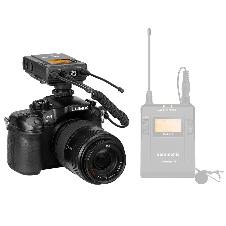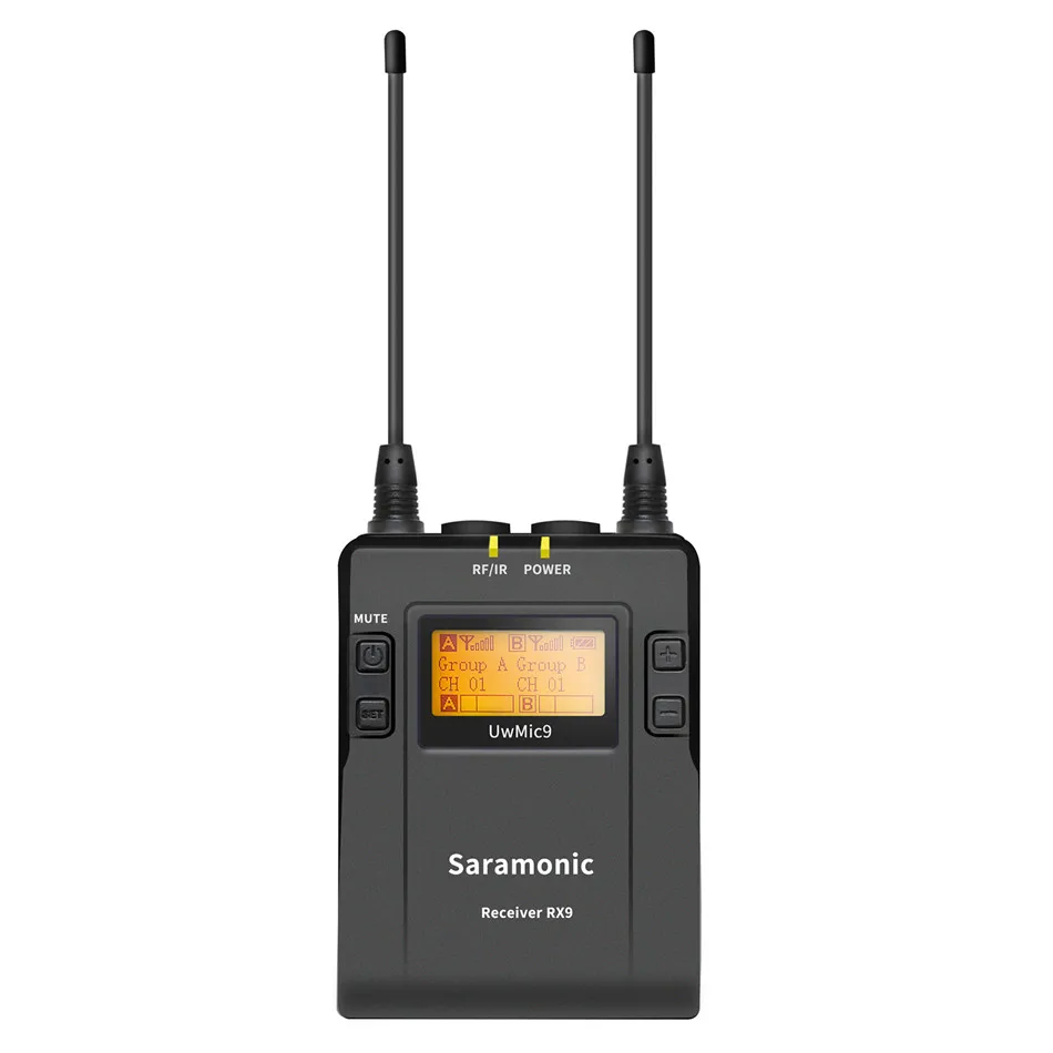 Двухканальный беспроводной приемник Saramonic RX9-Двухканальный беспроводной приемник для системы UwMic9. Несколько приемных устройств могут быть сопряжены одновременно с 1 или 2 передатчиками для многократной настройки выходной камеры. RX9-это встроенный беспроводной приемник с камерой. Он оснащен широким переключением полосы пропускания RF, удобным для чтения ЖК-дисплеем и инфракрасной синхронизацией между передатчиком и приемником. Оснащен функцией автоматического сканирования, Saramonic RX9 может автоматически искать доступную частоту передачи. Выбираемый режим вывода позволяет выбрать выходной сигнал для моно или стерео. Разъем для наушников обеспечивает мониторинг в реальном времени или приемник через наушники, особенно полезно для камер, у которых отсутствует выход монитора.