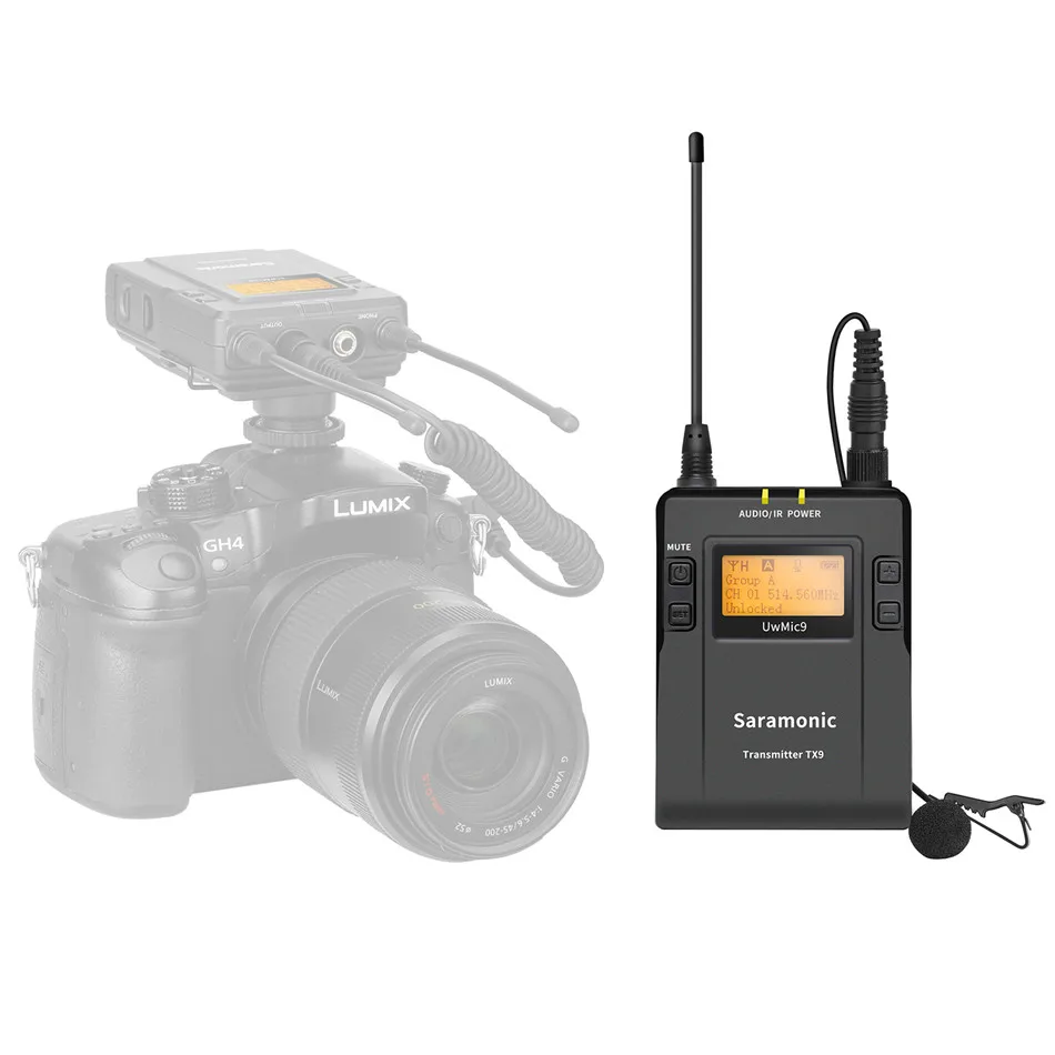 Saramonic UwMic9 TX9-это компактный передатчик с корпусом, в котором работает синтезатор PLL, контролируемый кристаллами. Он оснащен функцией отключения и входом микрофона BMP-type. Выходная мощность RF может быть переключена между высокими, средними и низкими. UwMic9 TX9 совместим с приемником RX9, он также может использоваться вместе с UwMic9 RX9 + TX9 посылка в качестве двухканального беспроводного микрофона. В комплект входит 1 беспроводной передатчик корпуса и 1 петлевой микрофон, отворот, зажим для ремня и ветровое стекло.