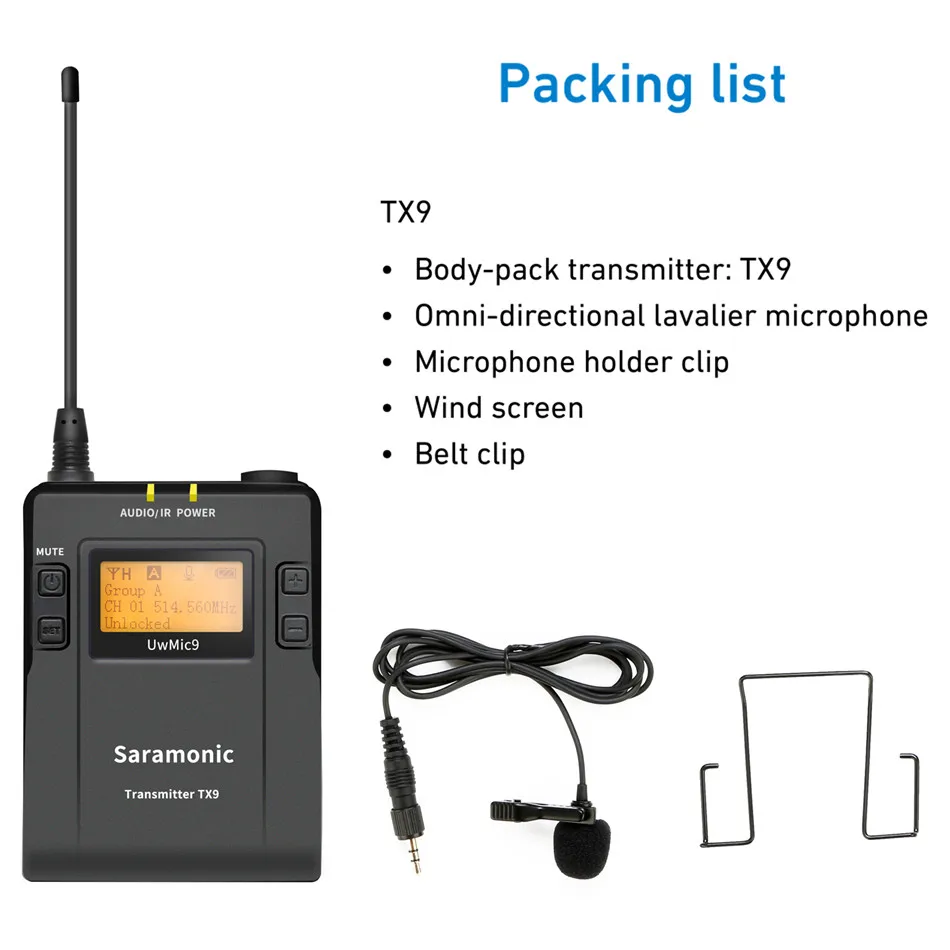 Передатчик корпуса: TX9 Ветровой экран Зажим для ремня Зажим для держателя микрофона Всенаправленный петличный микрофон